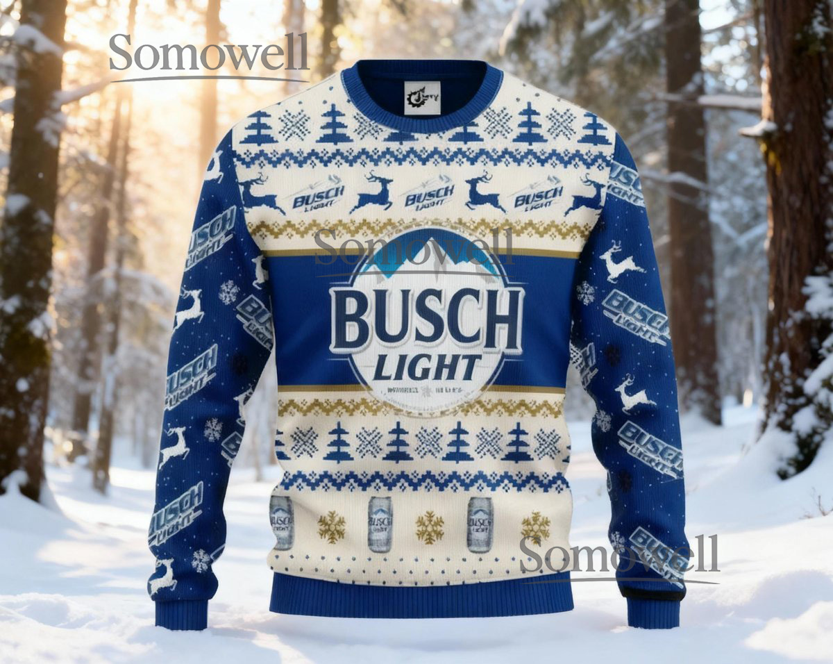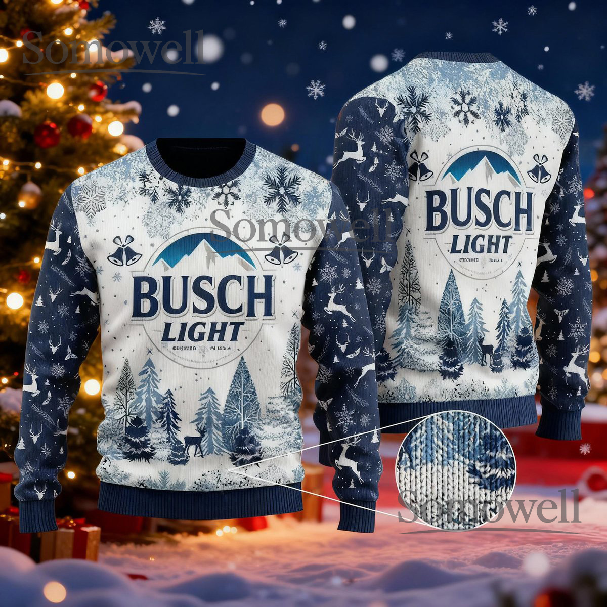 Busch Light Winter Forest Blue Ugly Christmas Sweater Beer Lovers Snow Knit Jumper