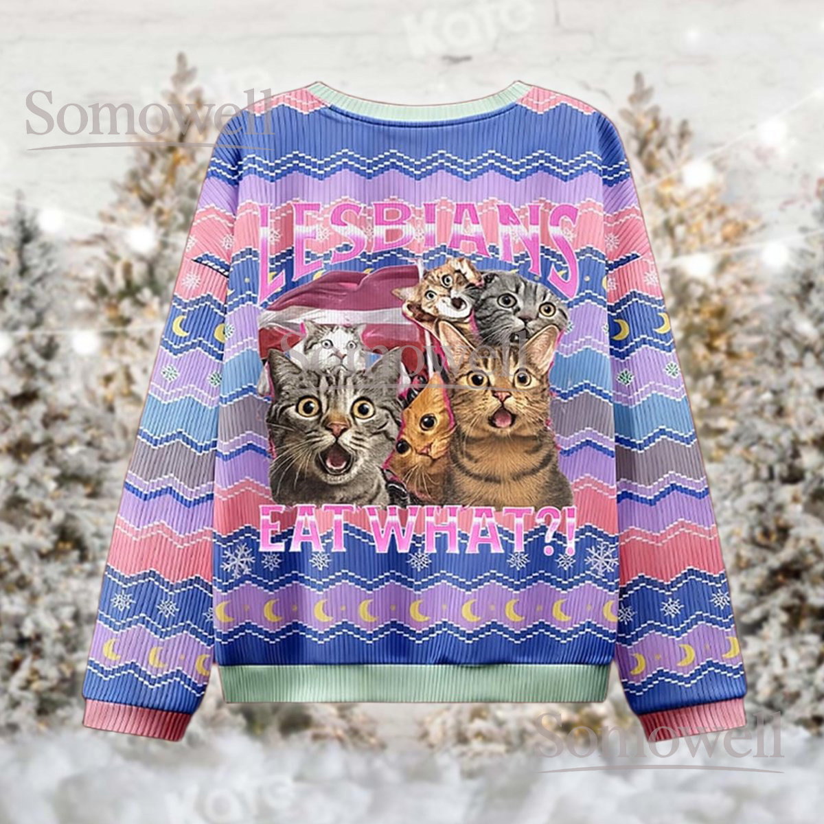 Lesbians Eat What Cat Meme Ugly Christmas Sweater Funny LGBTQ Gift Holiday Party