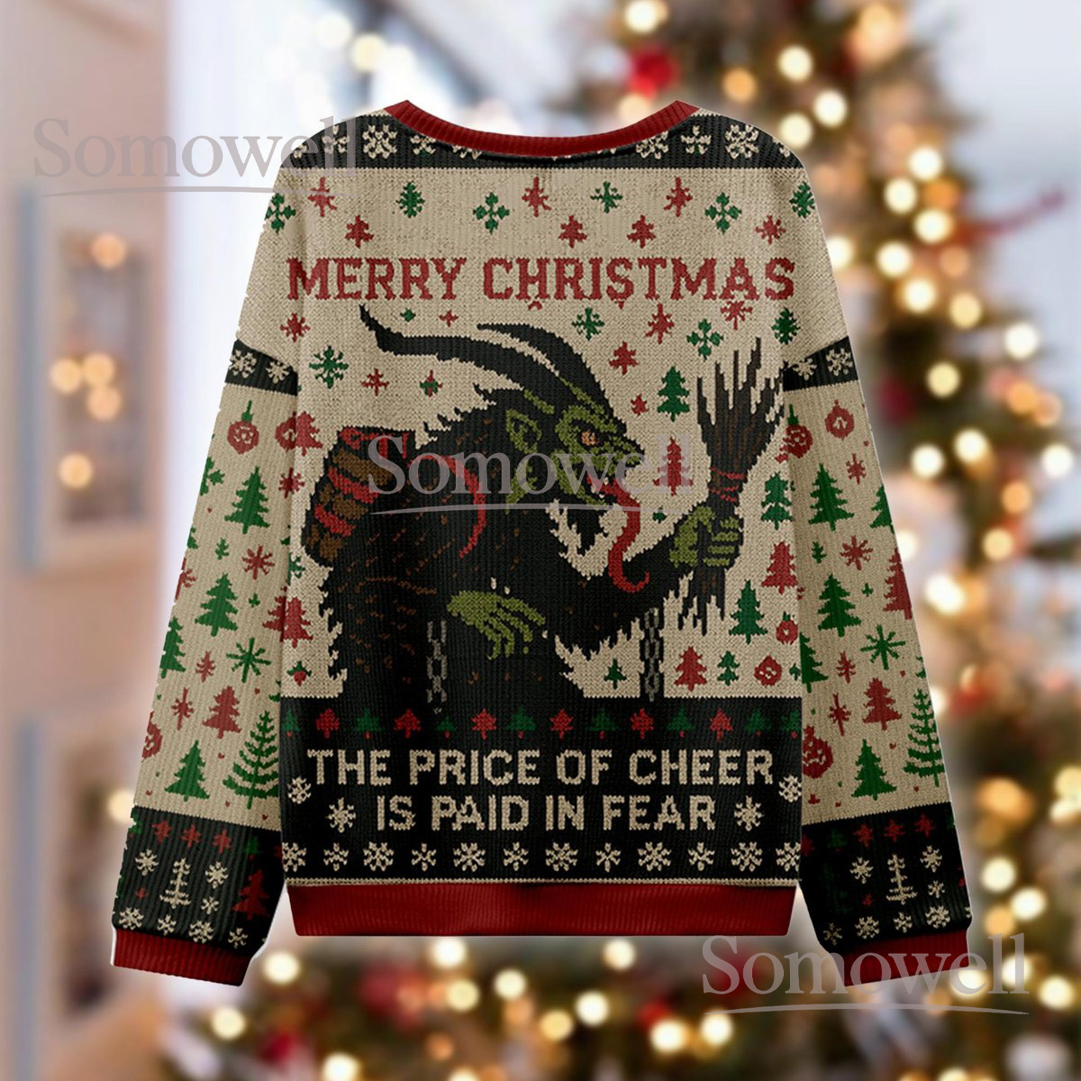 Krampus Beige Green Christmas Ugly Sweater The Price of Cheer Is Paid in Fear Knit Jumper