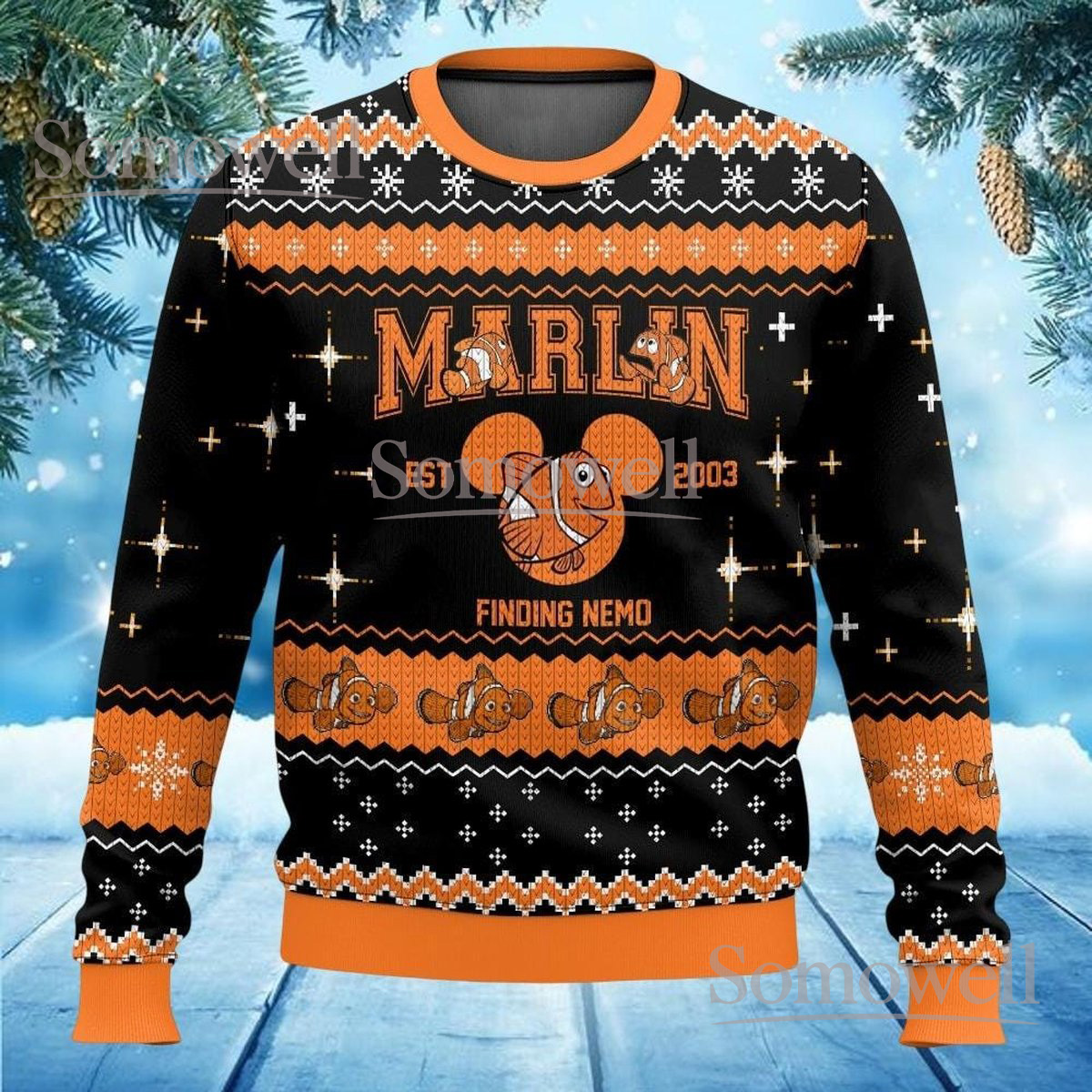 Finding Nemo Marlin Black Orange Christmas Ugly Sweater Ocean Fish Holiday Knit Jumper