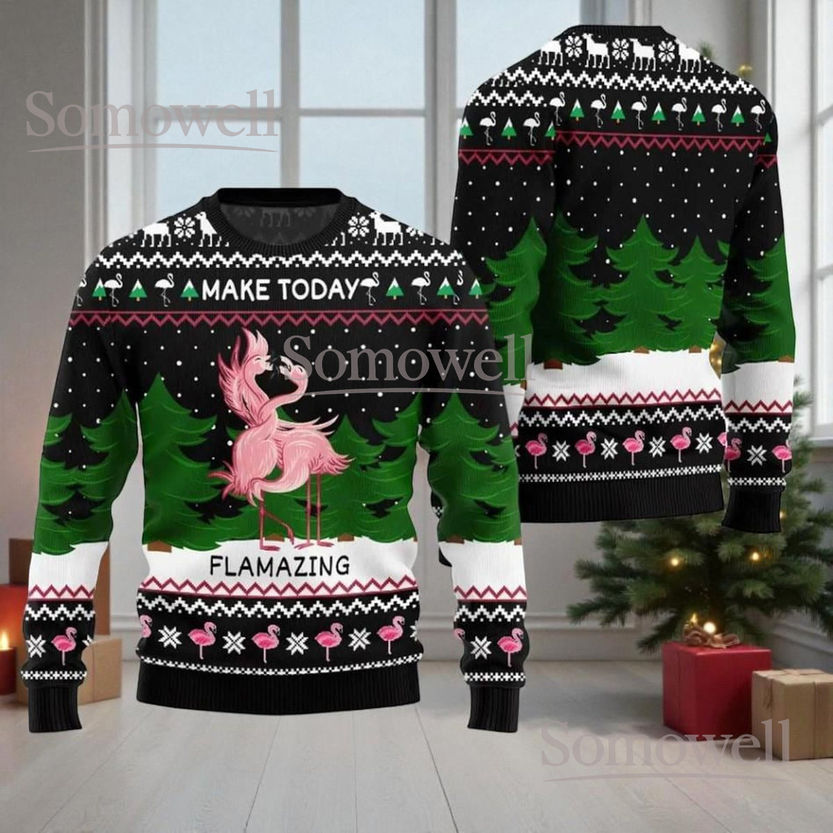 Flamingo Pink Green Christmas Ugly Sweater Make Today Flamazing Holiday Knit Jumper