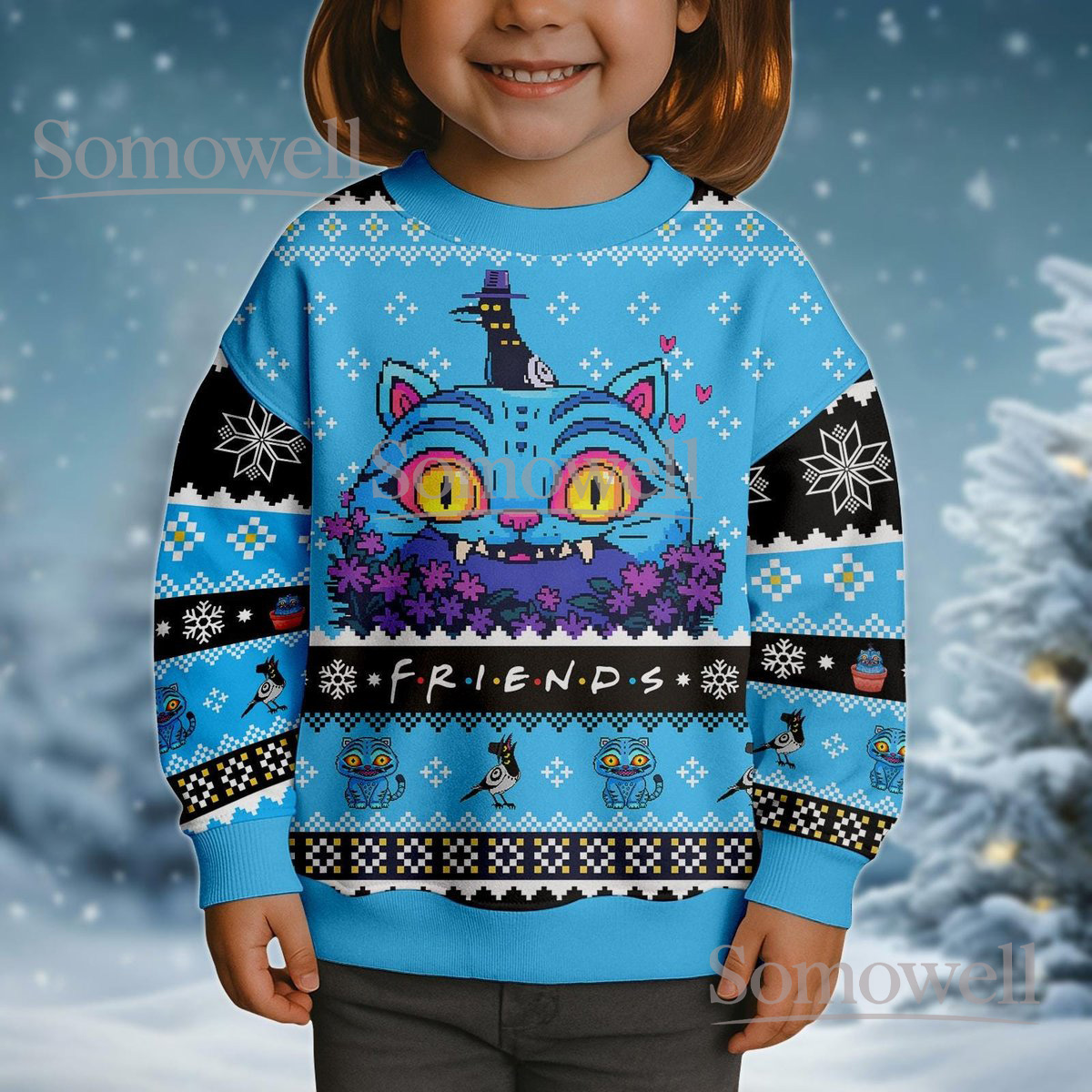 Derpy Tiger With Bird Friends Ugly Christmas Sweater Cute Blue Cat Holiday Gift