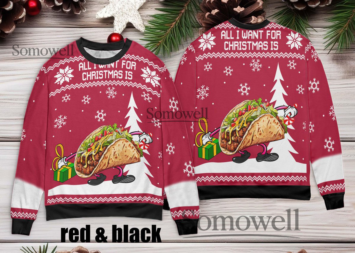 All I Want For Christmas Is Taco Funny Food Ugly Christmas Sweater Black Red Festive Edition Multi Color Edition