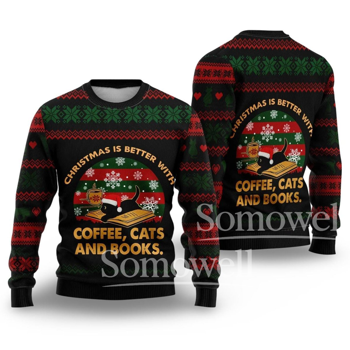 Christmas Sweater with Coffee Cats and Books Funny Holiday Knit Pullover Gift for Readers