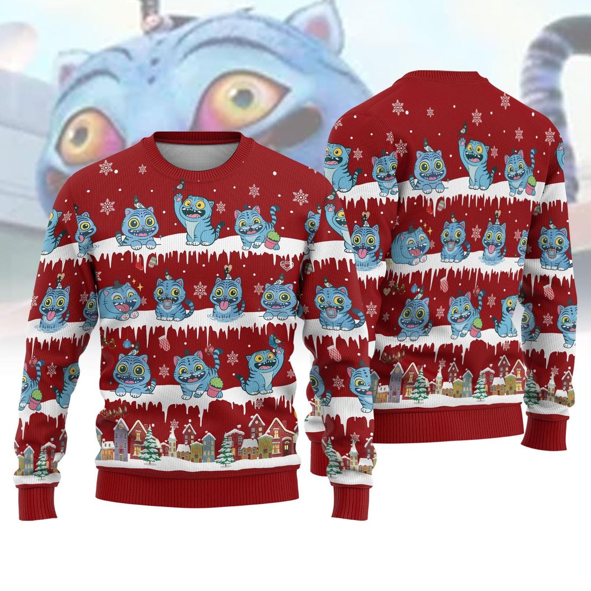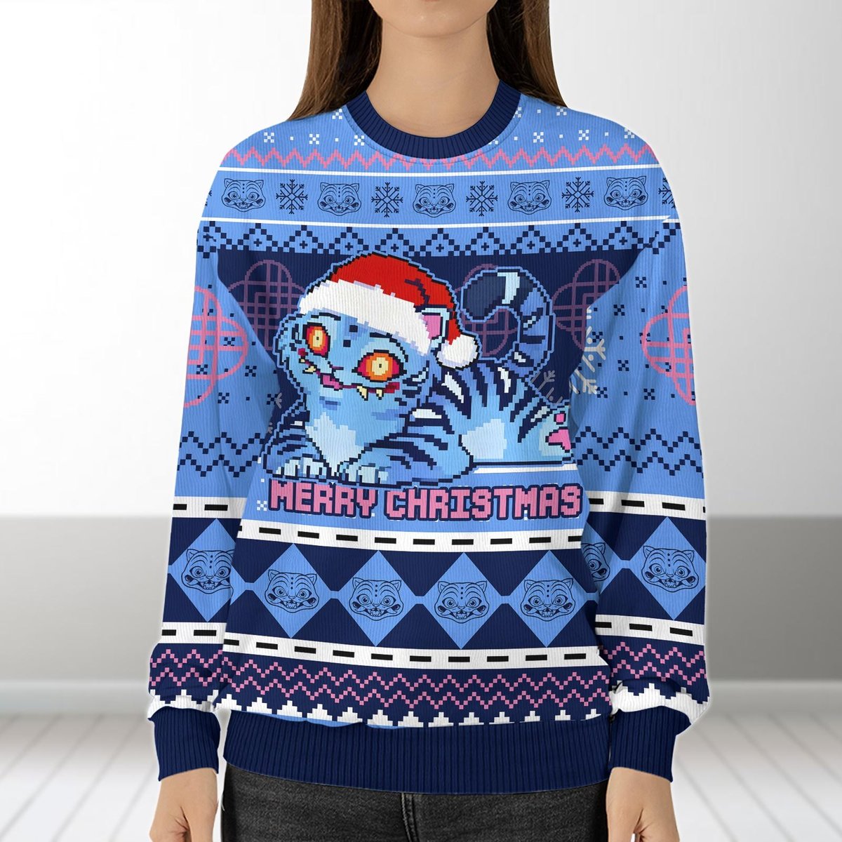 Derpy Tiger Pattern Ugly Sweater Funny Blue Cat Lovers Christmas Holiday Gift