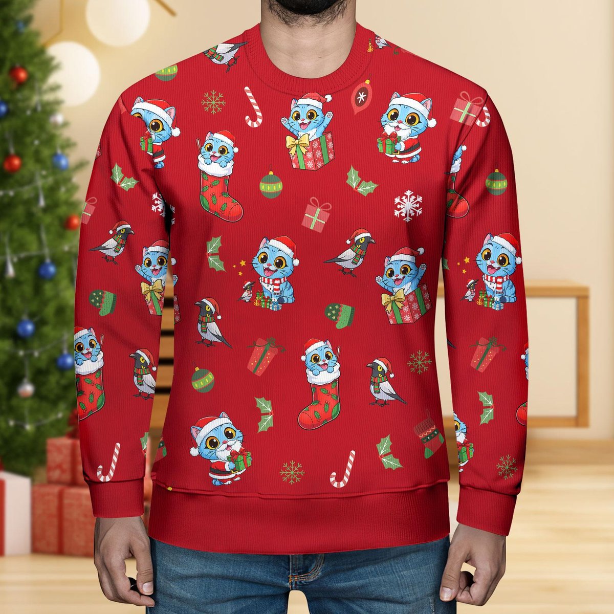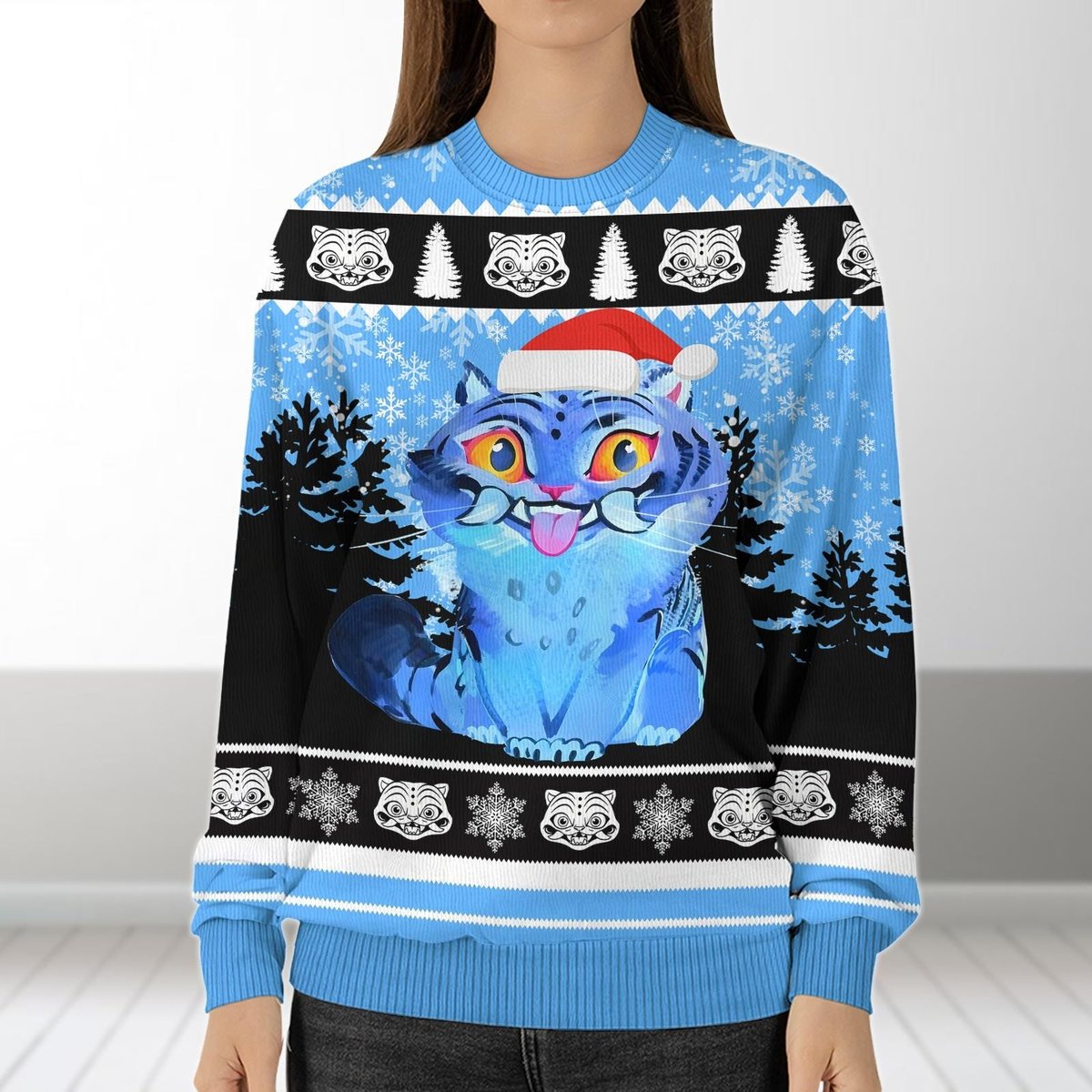 Derpy Tiger With Bird Friends Ugly Christmas Sweater Cute Blue Cat Holiday Gift