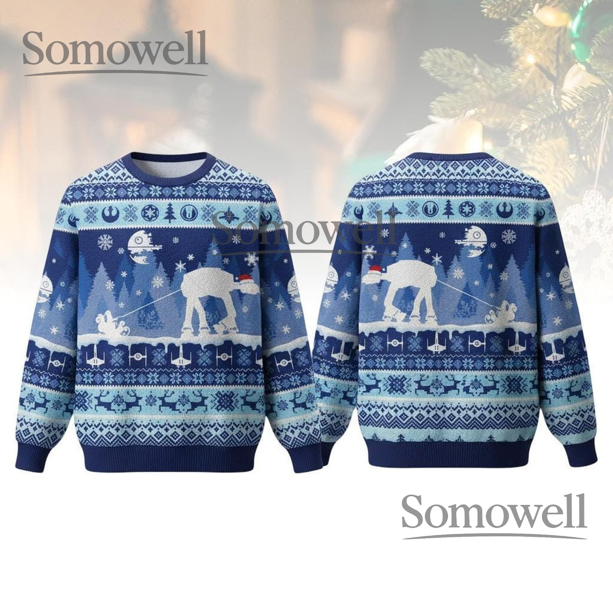AT AT Walker Star Wars Christmas Sweater Blue Snowy Scene Funny Winter Holiday Knit