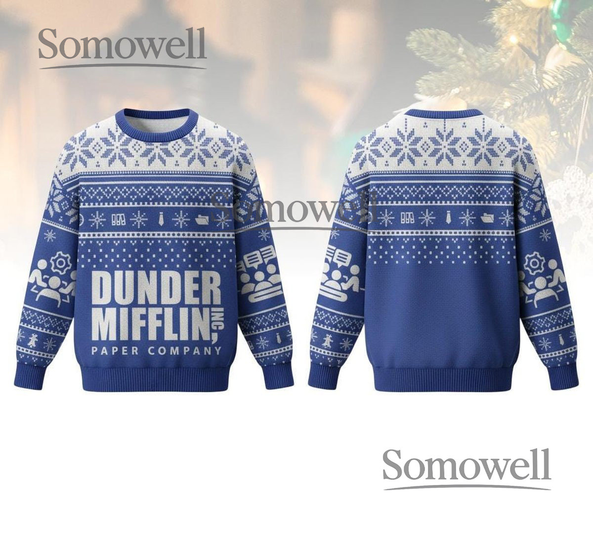 Dunder Mifflin The Office Christmas Sweater Blue Snowflake Pattern Holiday Gift