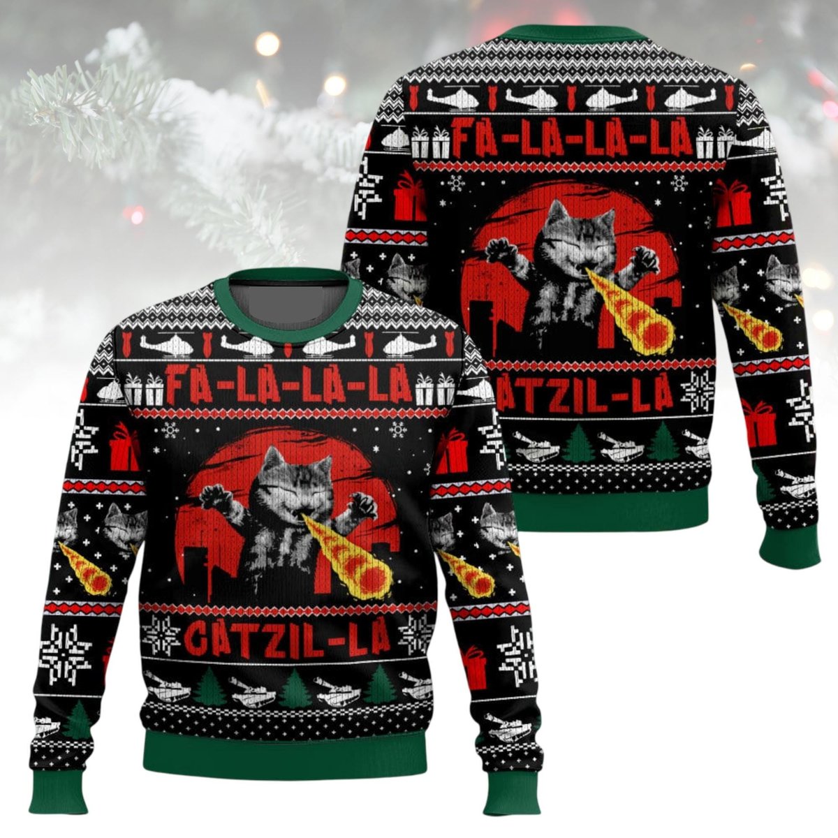 Fa-La-La-La Gatzilla Ugly Christmas Sweater Funny Catzilla Cat Lover Holiday Knit Jumper
