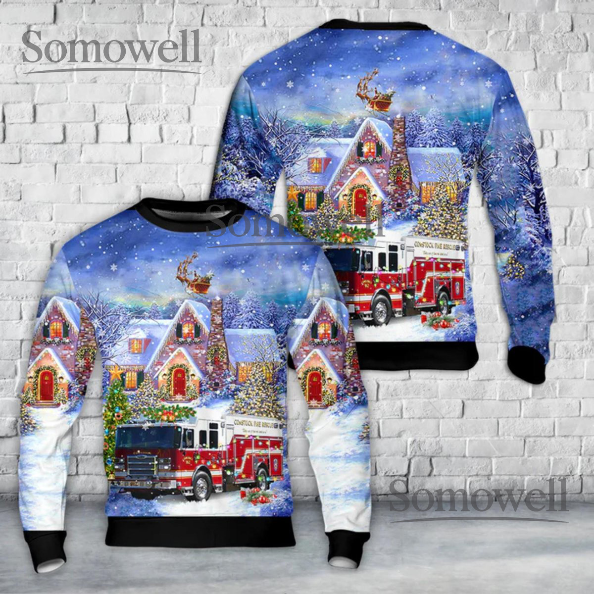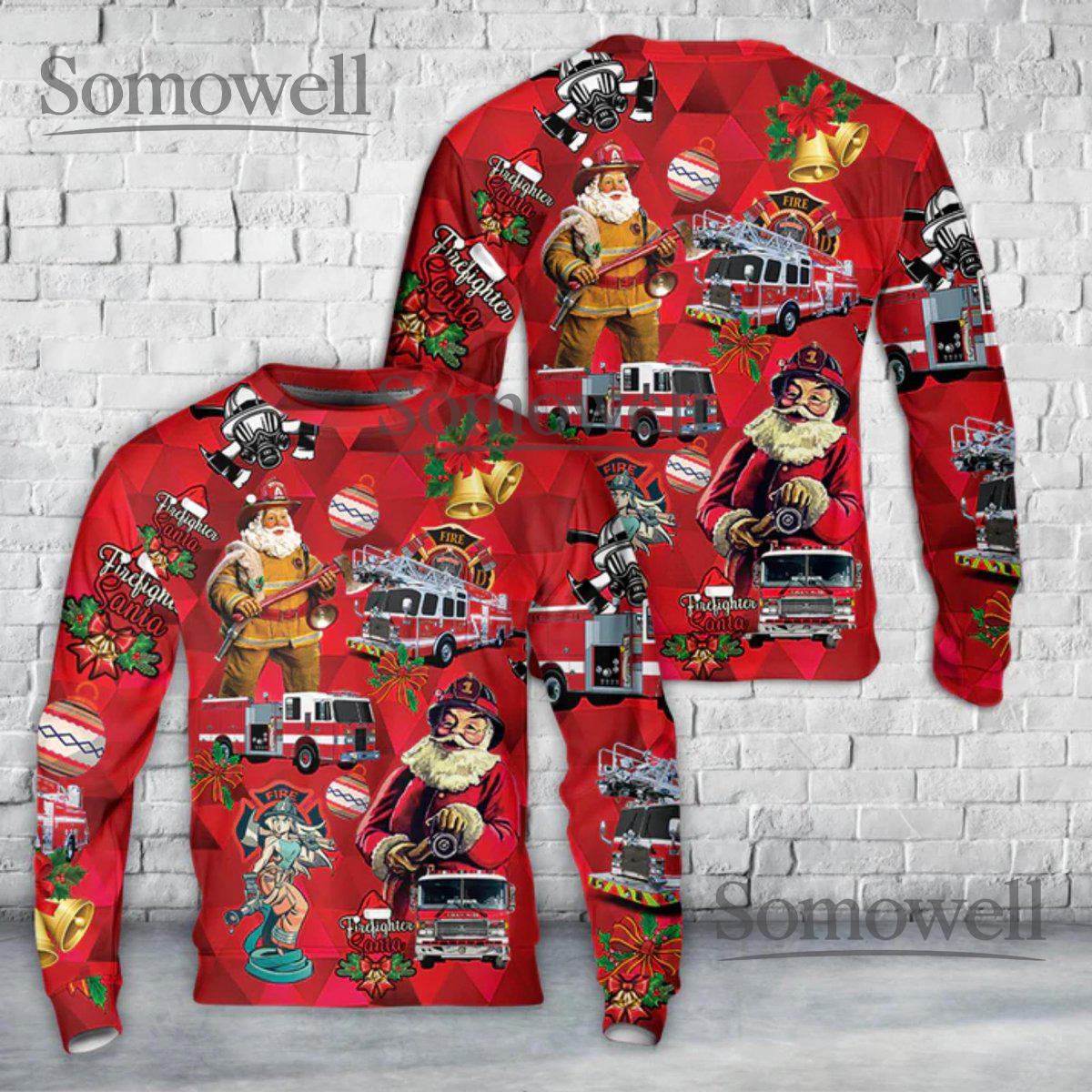 Firefighter Santa Ugly Christmas Sweater Fire Truck Holiday Pullover Gift Unisex