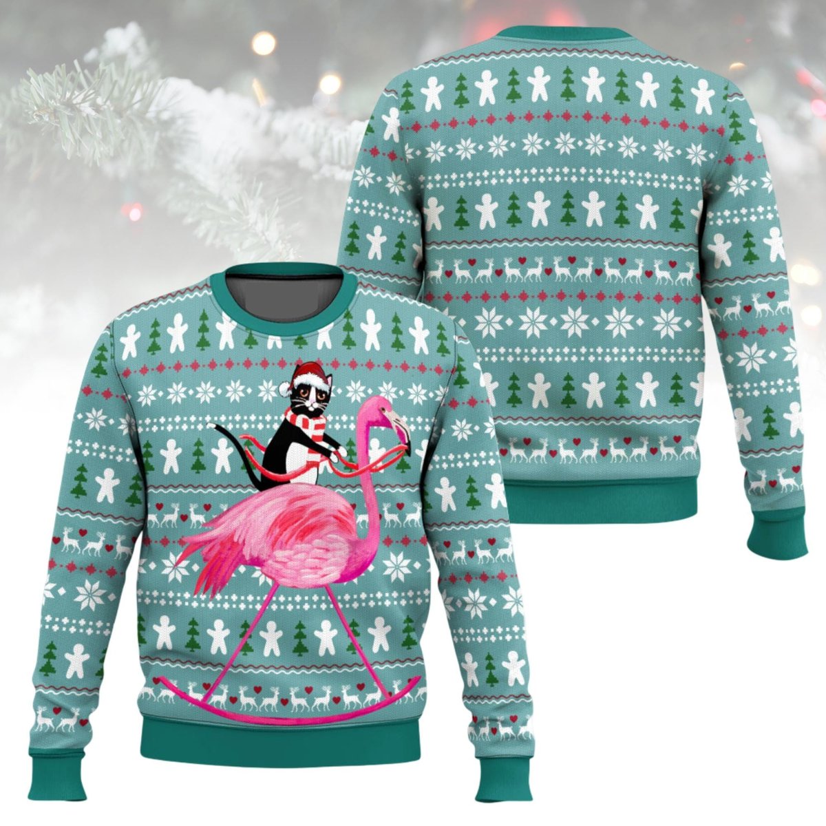Flamingo Cat Funny Holiday Ugly Christmas Sweater Blue Green Jumper