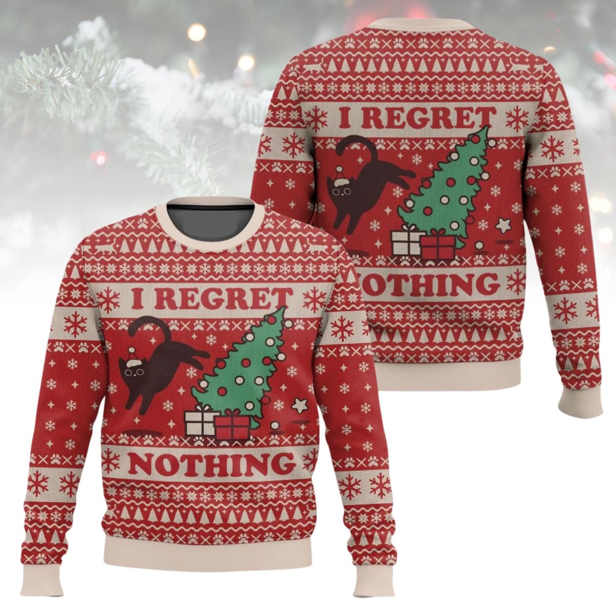 Funny Cat I Regret Nothing Tree Ugly Christmas Sweater Red Beige Jumper