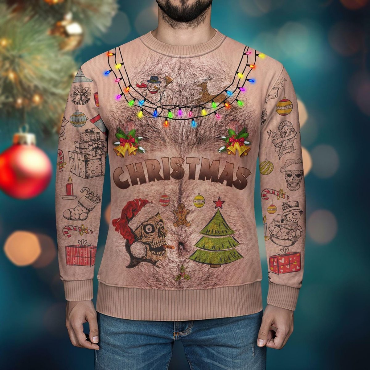 Funny Chest Hair Christmas Ugly Sweater Tattoo Santa Skull Beard Holiday Knit Jumper