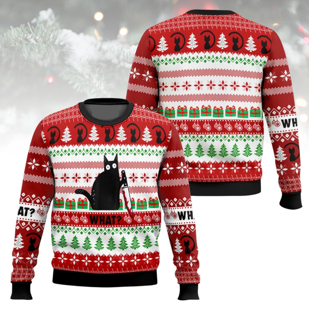 Funny Cat What Meme Ugly Christmas Sweater Red Green Holiday Jumper