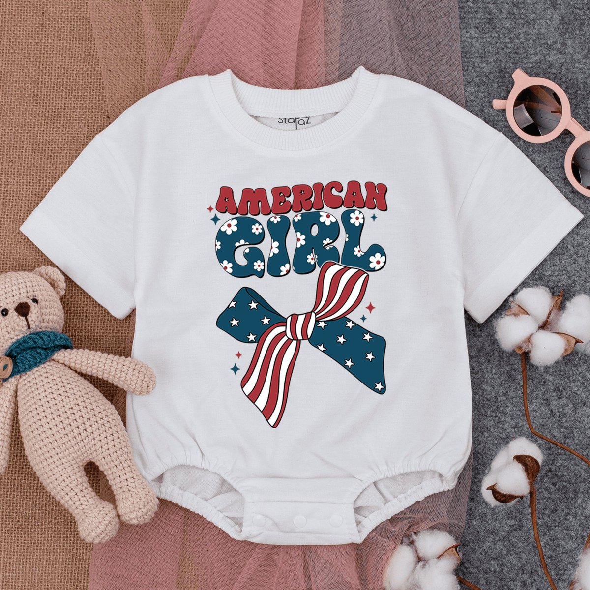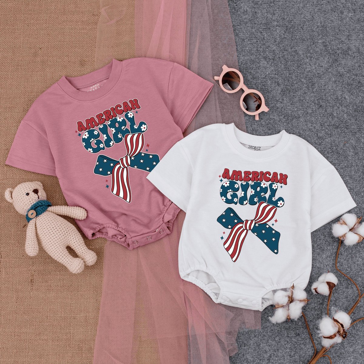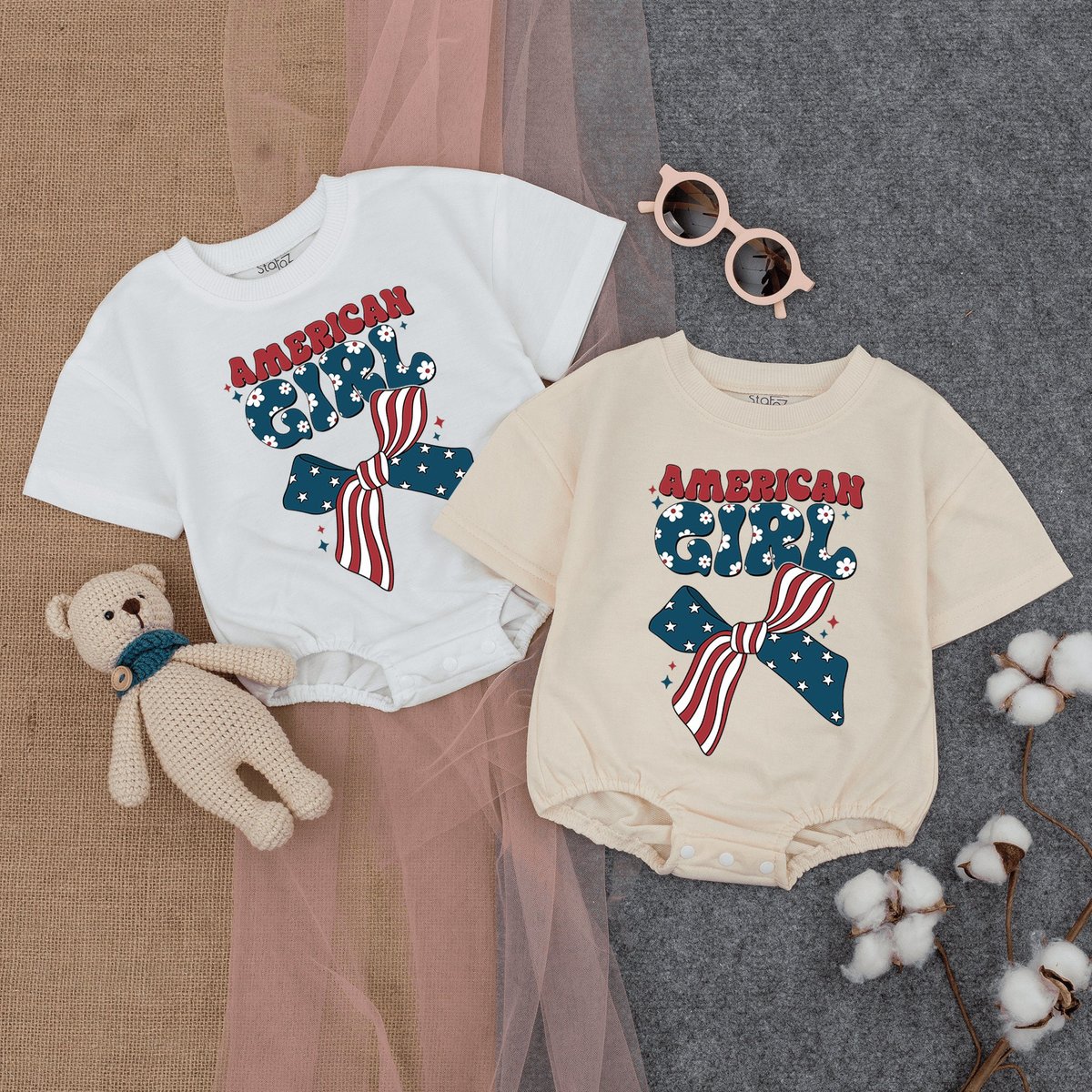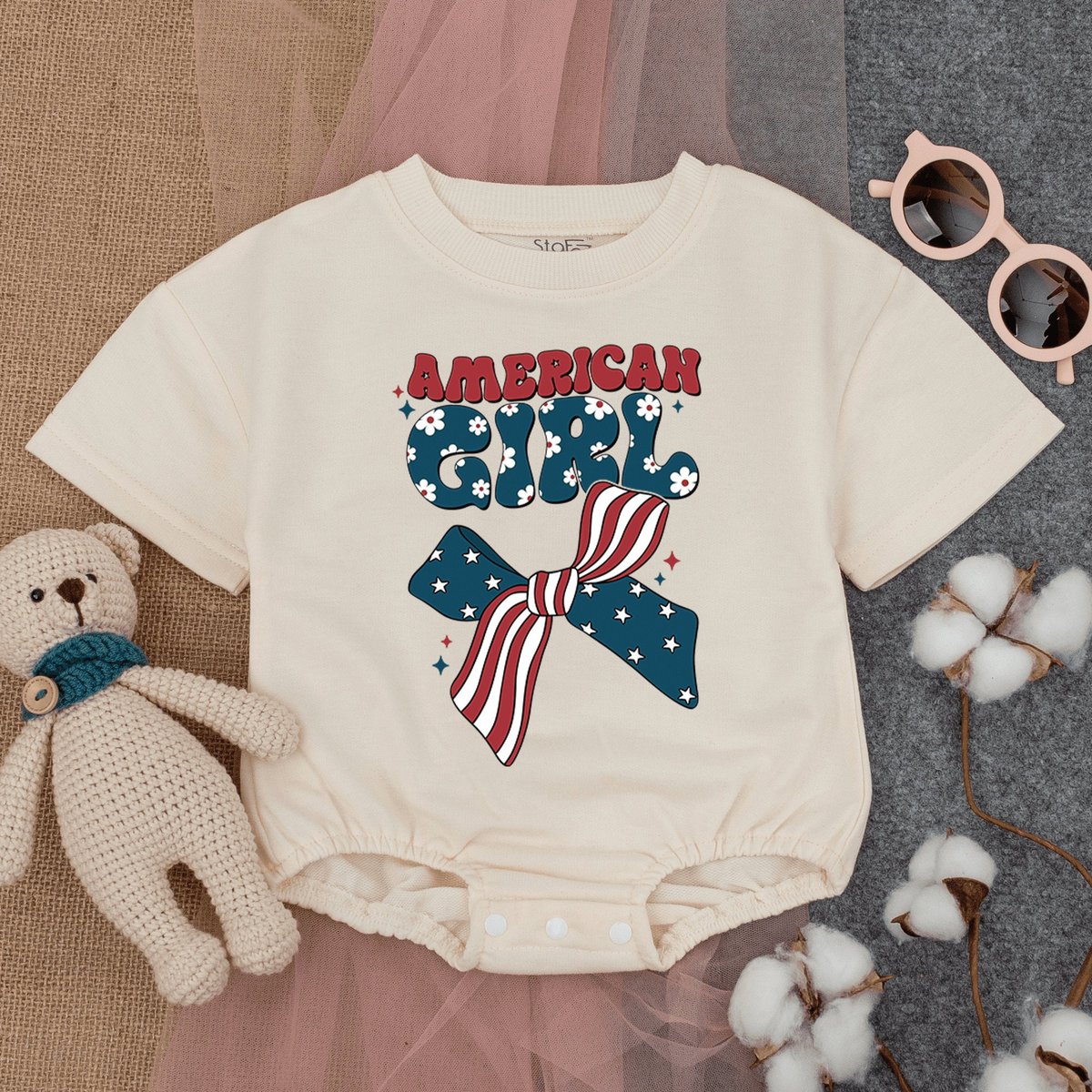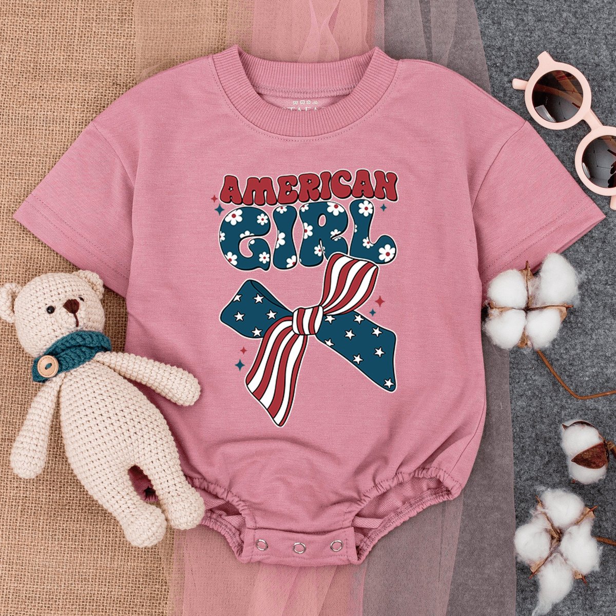 American Girl Bubble Romper Short Sleeve Retro Patriotic Bodysuit Cute Fourth of July Baby Indepen 170