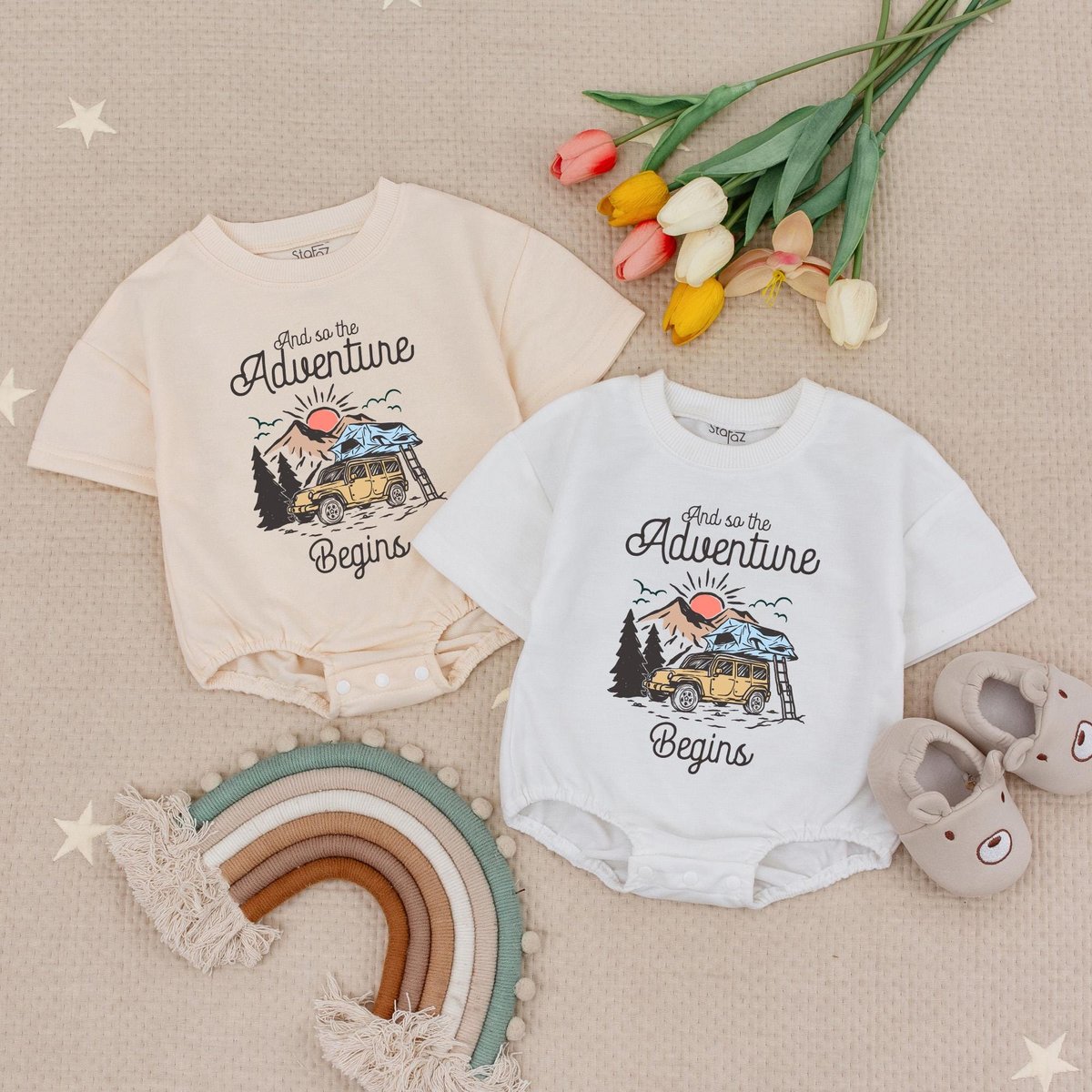 And So The Adventure Begins Baby Romper Retro Announcement Babysuit Camping Natural Babysuit Baby Sh