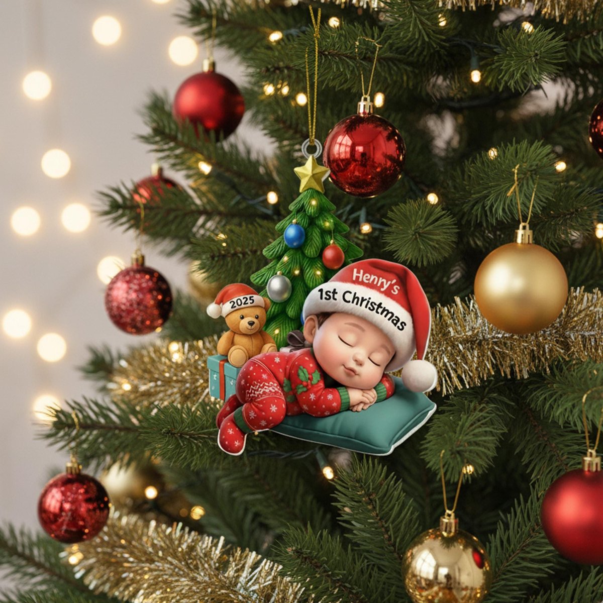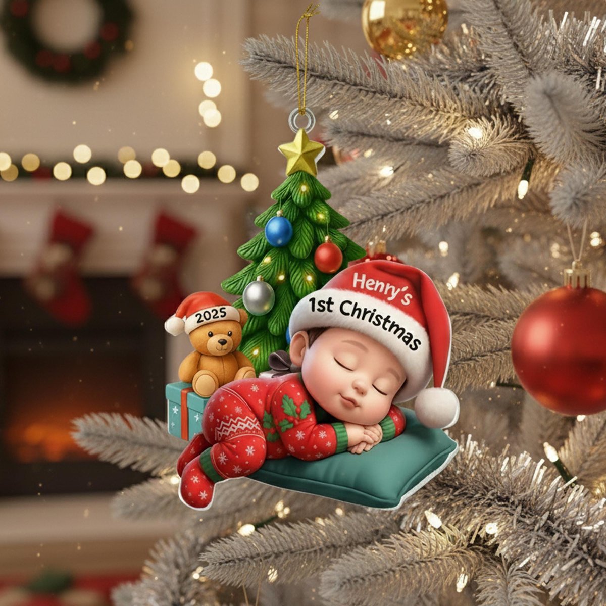 Babys First Christmas Ornament Personalized Acrylic Bauble Sleeping Baby in Xmas Pajamas