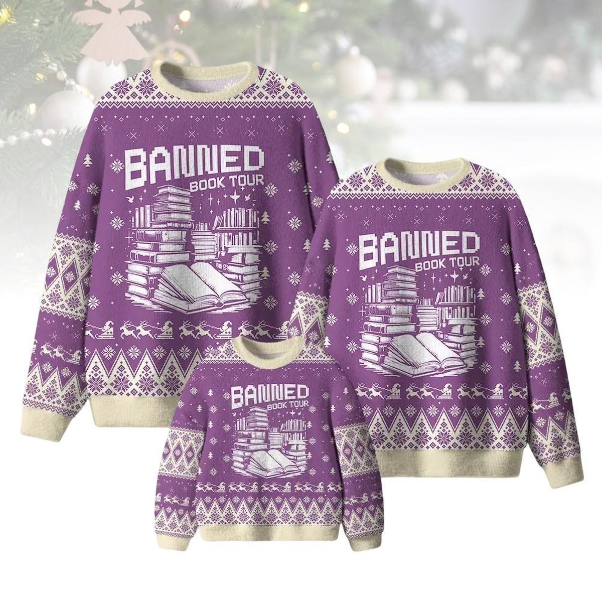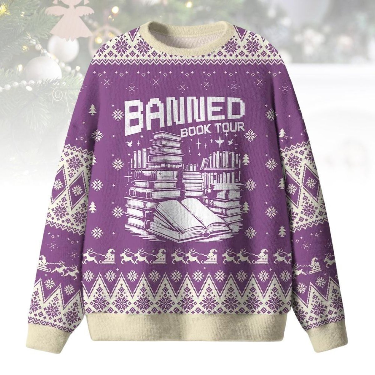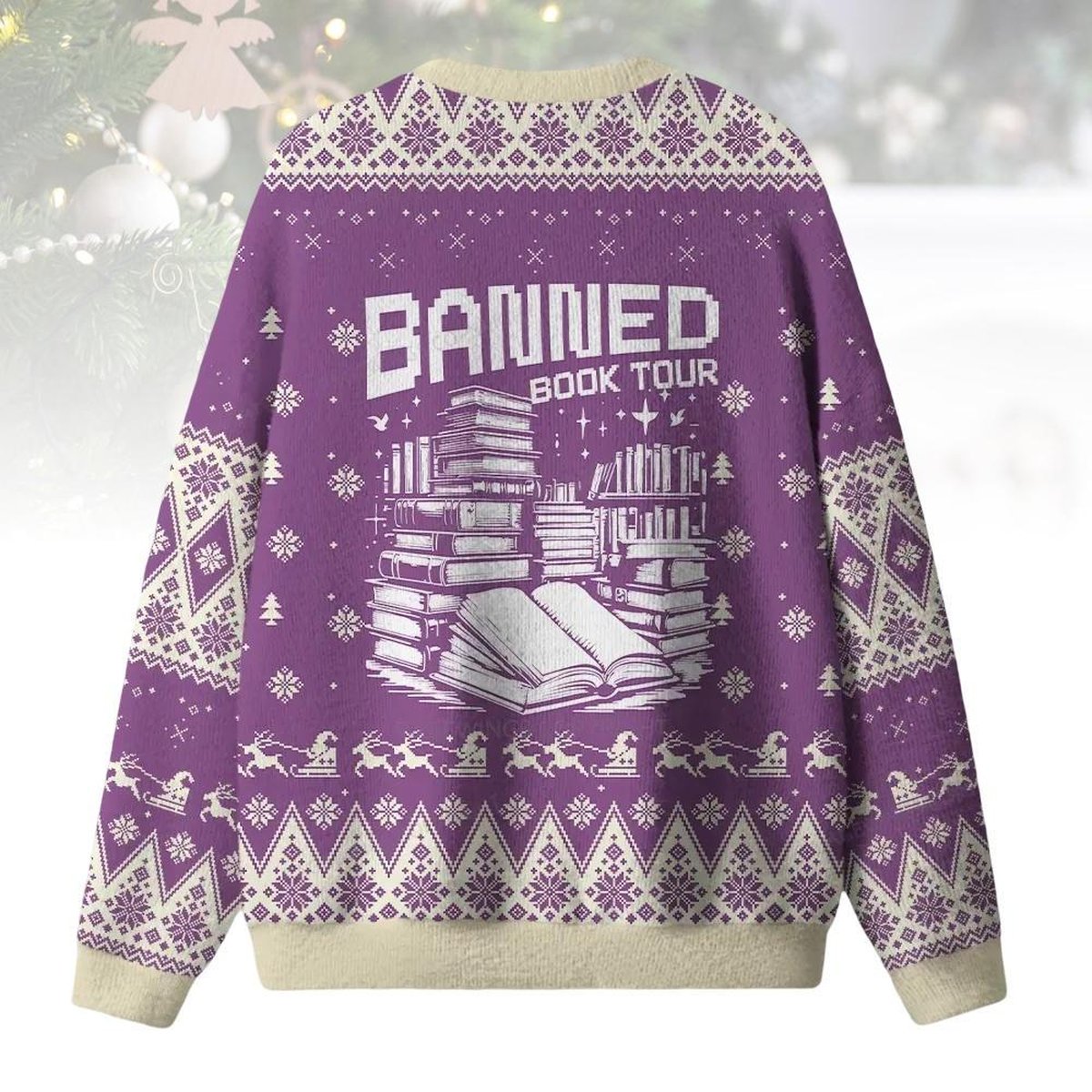 Banned Book Tour Reading Lover Ugly Christmas Sweater Purple Holiday Knit Pullover Gift
