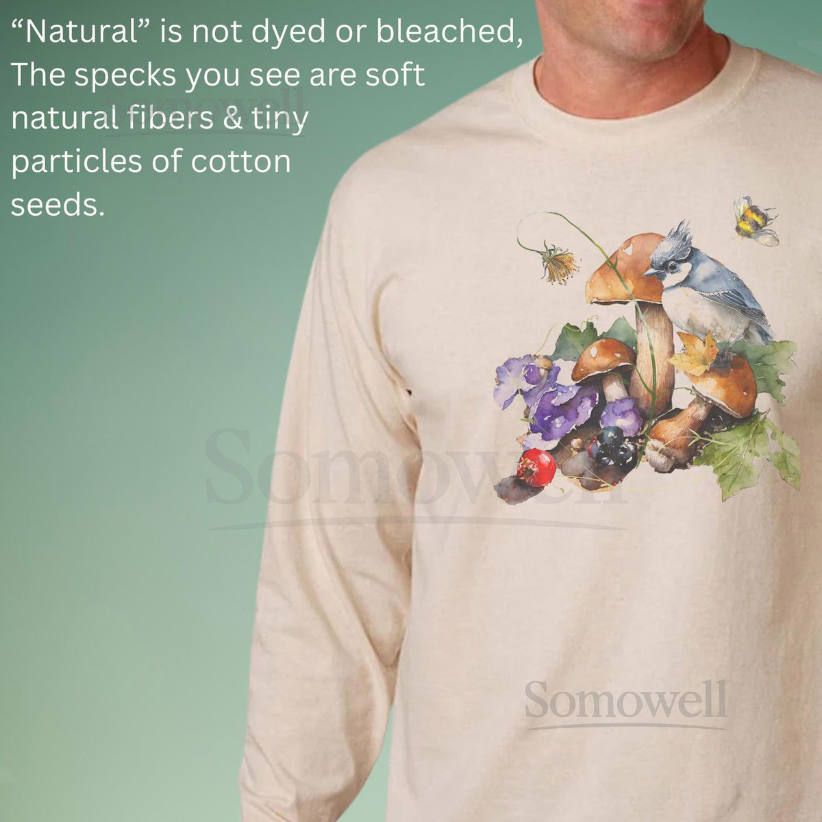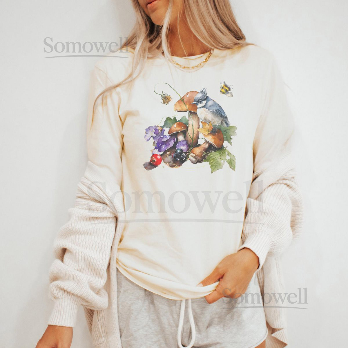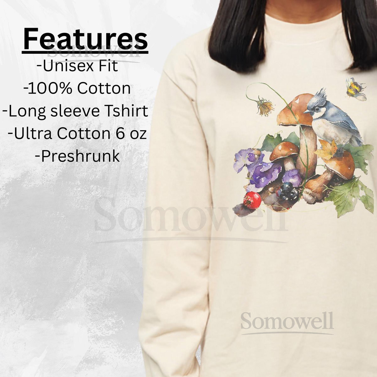 Blue Jay Bird and Mushroom Forest Art Long Sleeve Shirt Watercolor Wildflowers Woodland Nature Tee Botanical Wildlife Graphic Unique Design_85