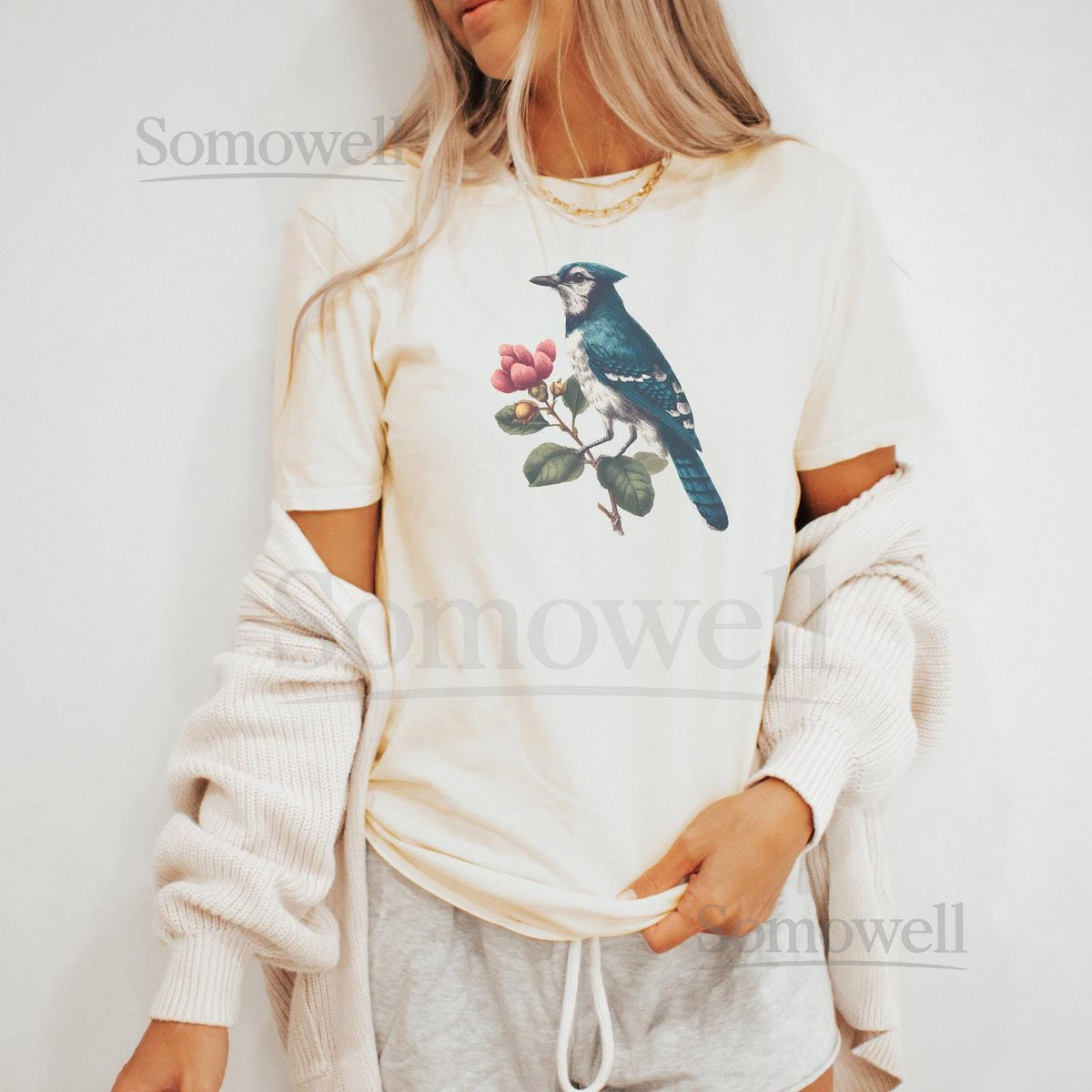 Blue jay bird floral graphic nature illustration animal art t shirt botanical garden bird lover tee_89
