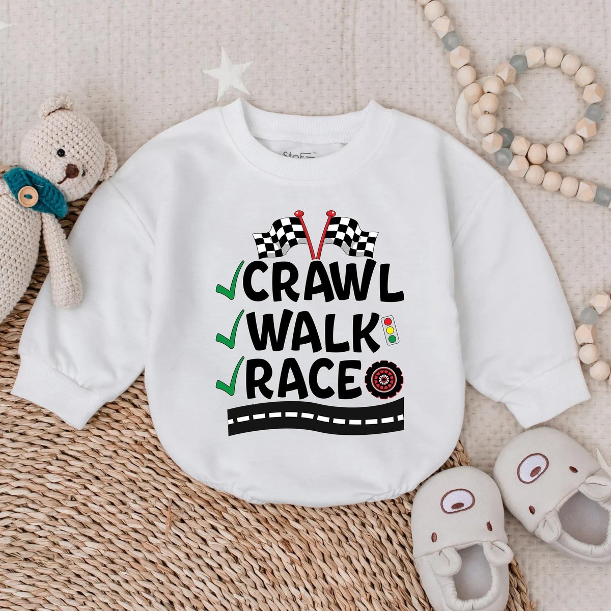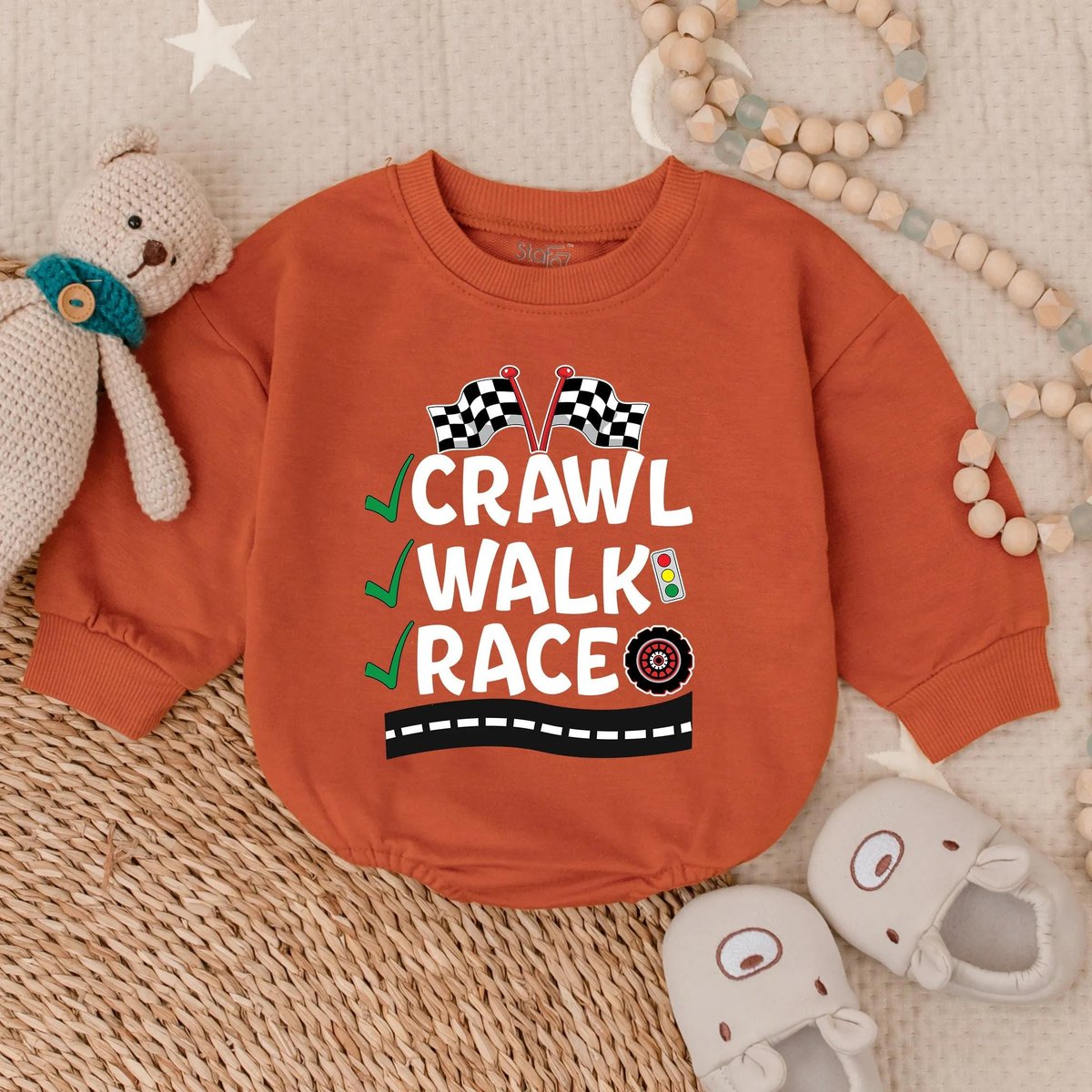 Crawl Walk Race Baby Bubble Bodysuit Funny Race Car Romper Baby Boy Racing Outfit Race Fan Baby Show