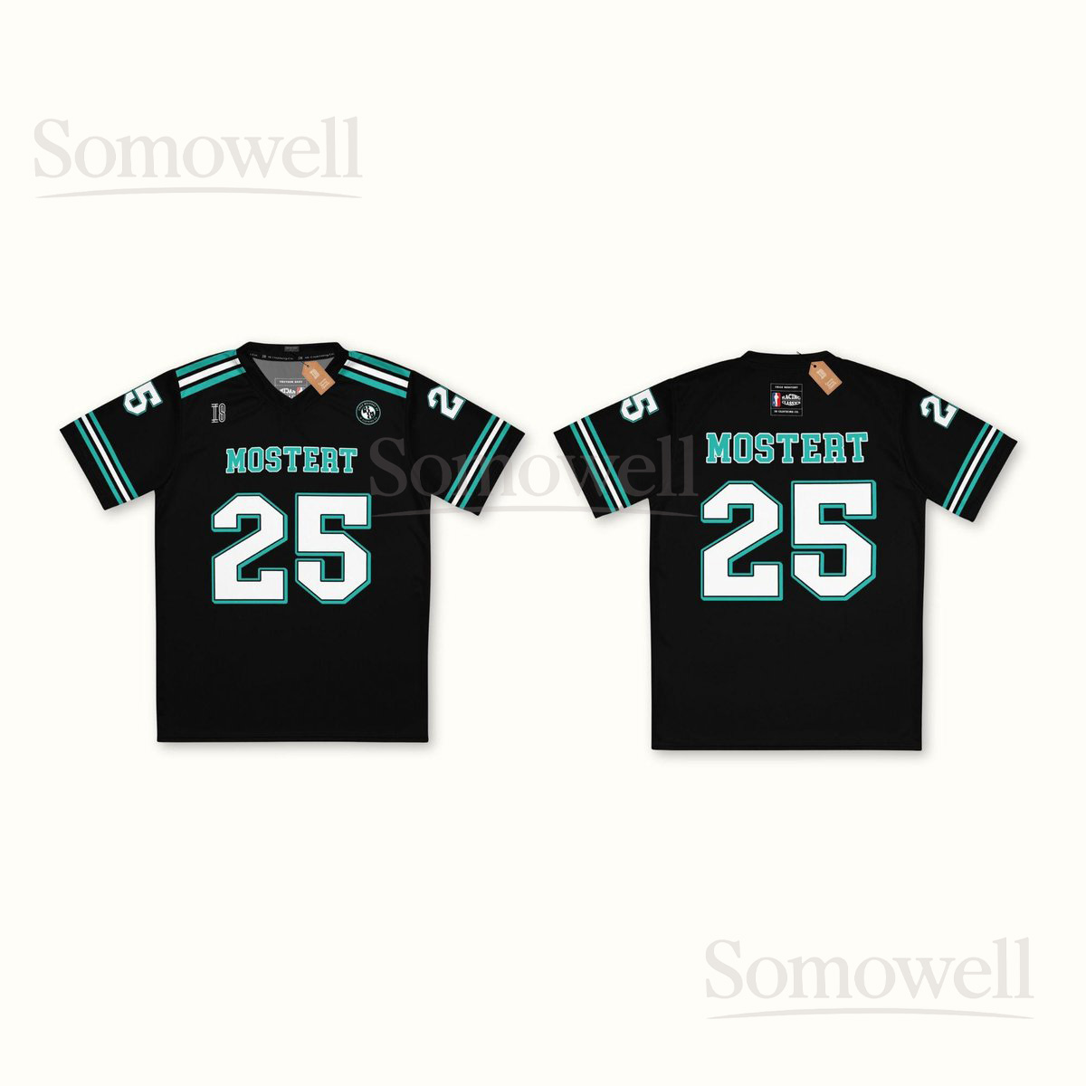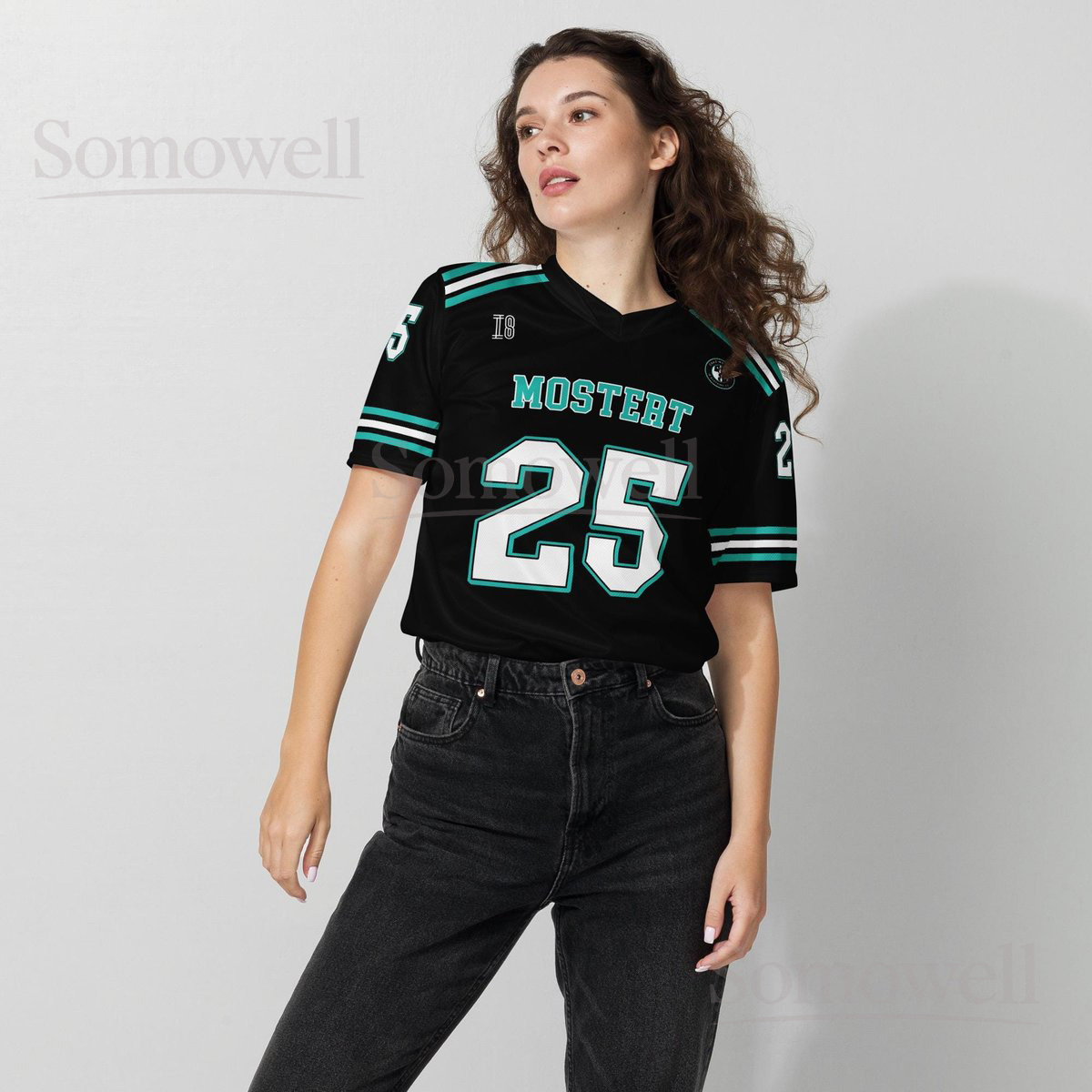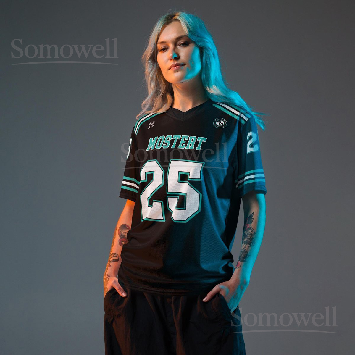 Custom Chaz Mostert Supercars Football Jersey Shirt for Racing Fans Black and Aqua Motorsport Apparel Made from Recycled Polyester