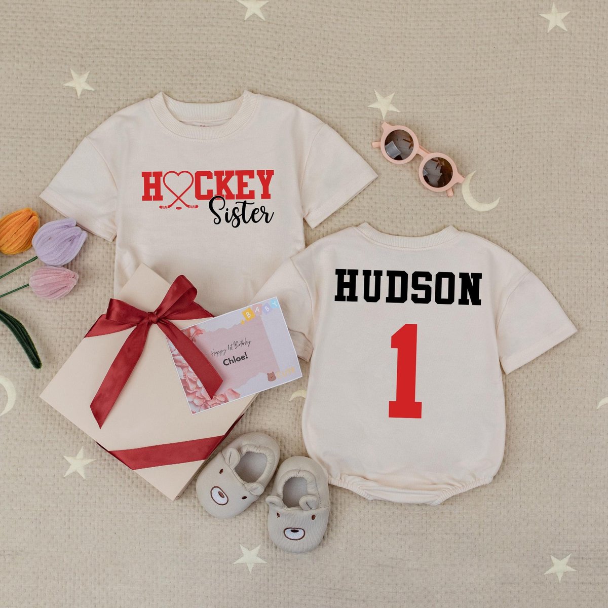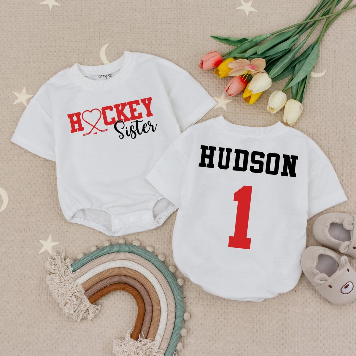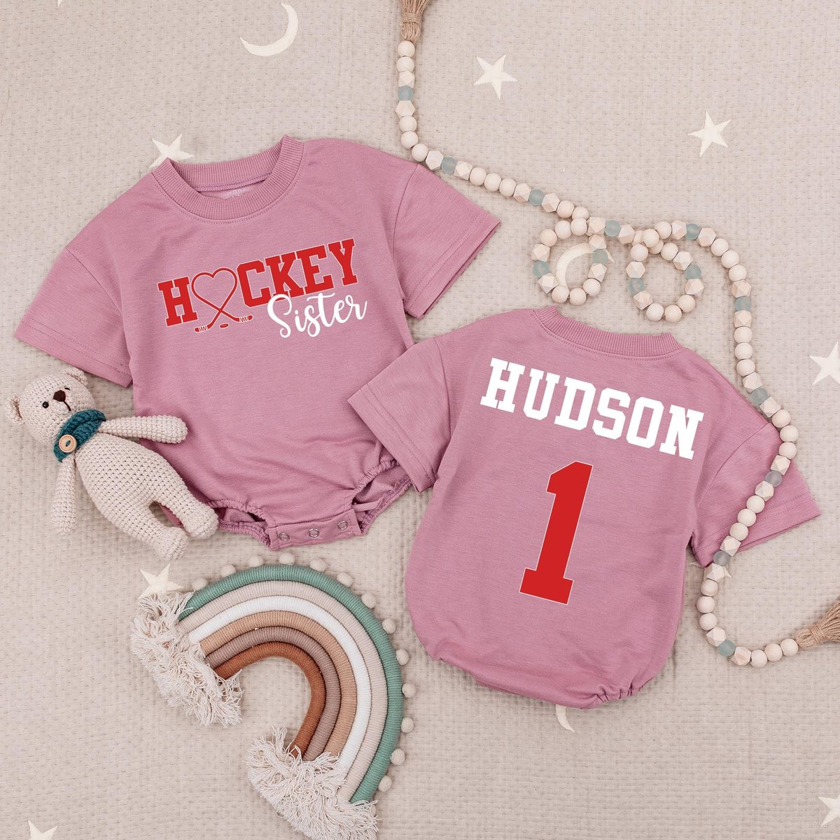Custom Name and Number Hockey Sister Bubble Romper Hockeyl Lil Sis Babysuit His Biggest Fan Personal