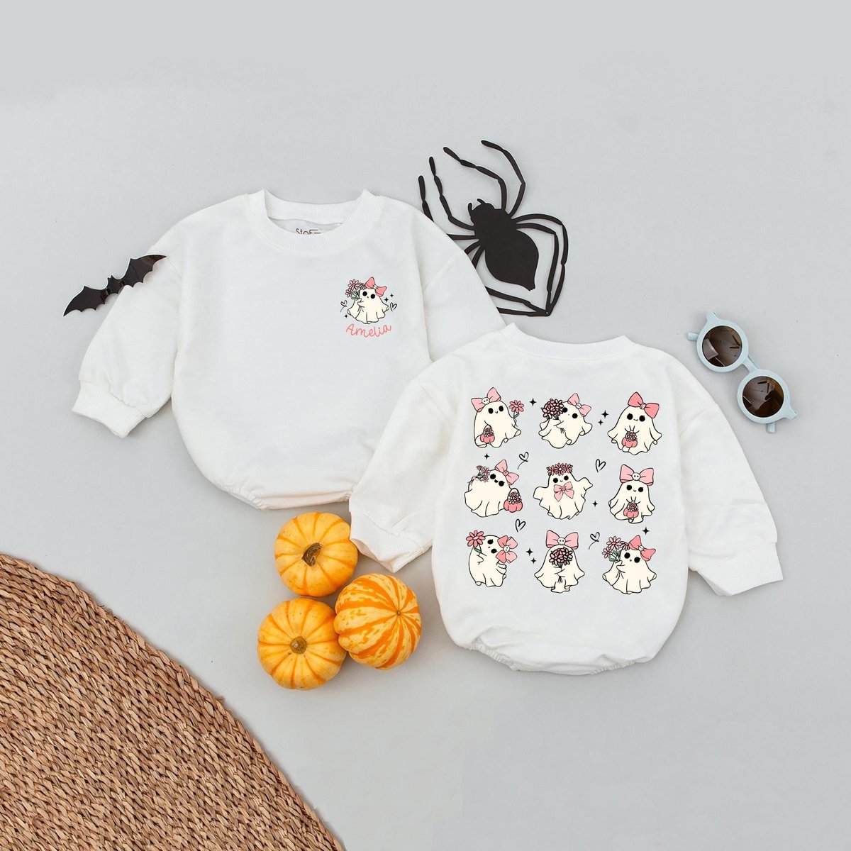 Custom Name Bow Pink Ghost Baby Romper Personalized Halloween Baby Girl Outfit Cute Ghost Babysuit S