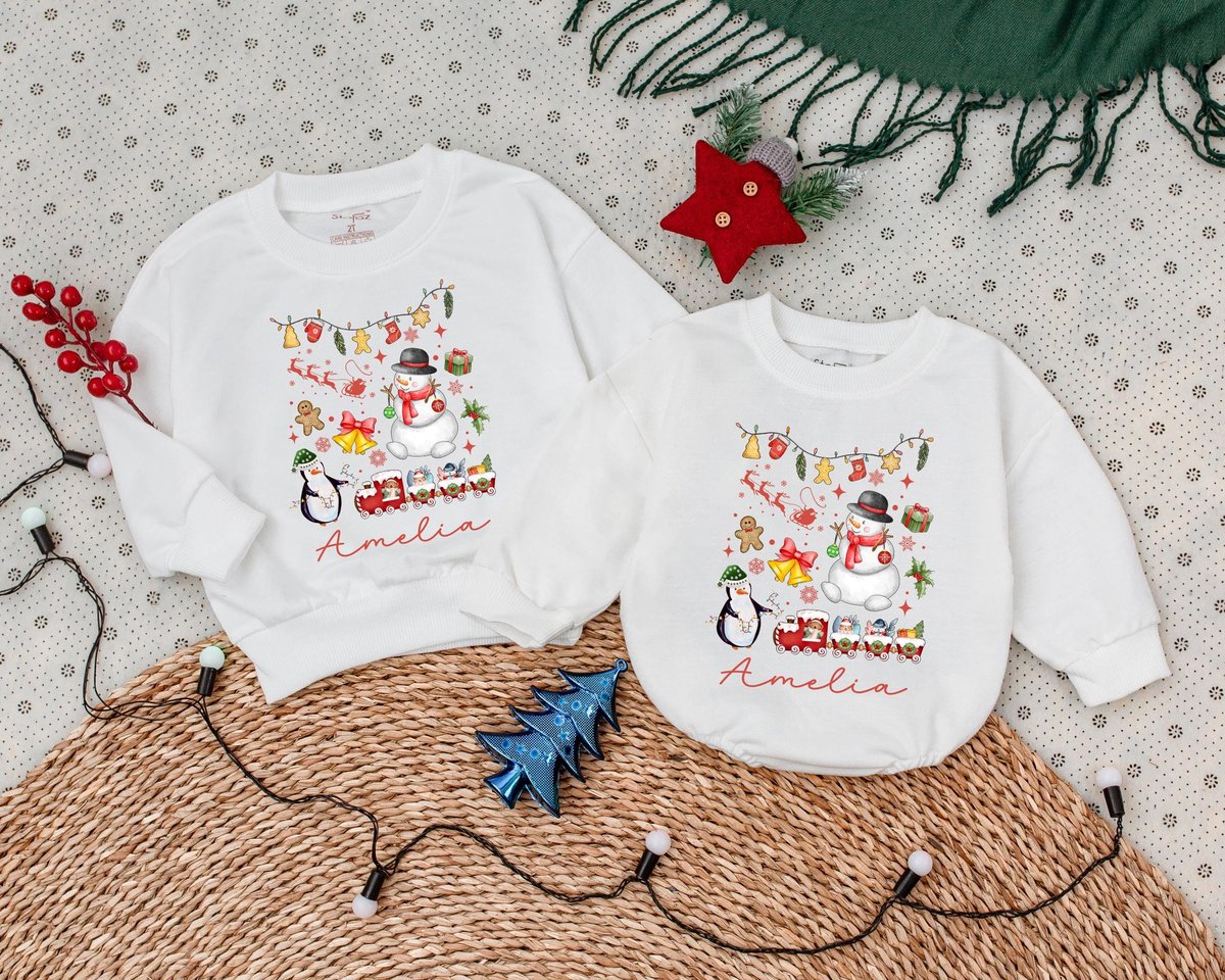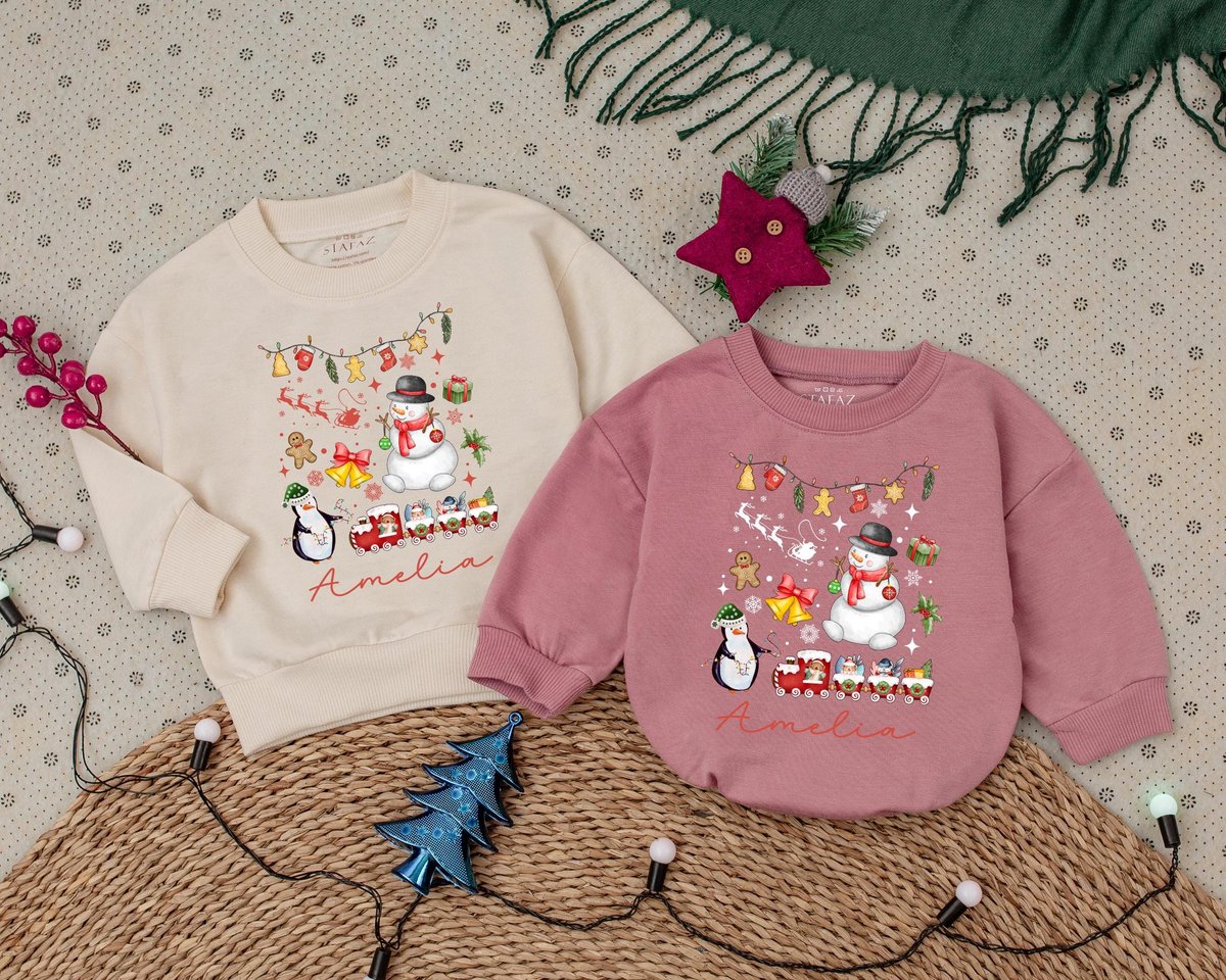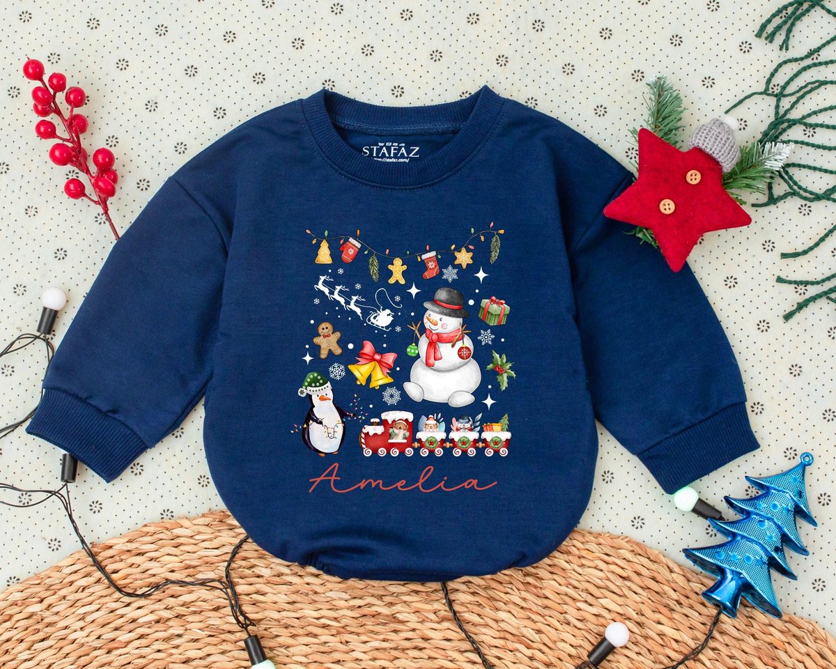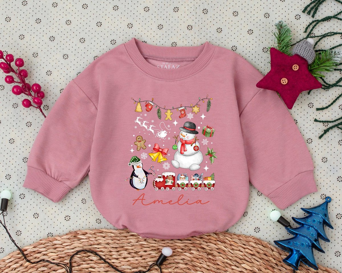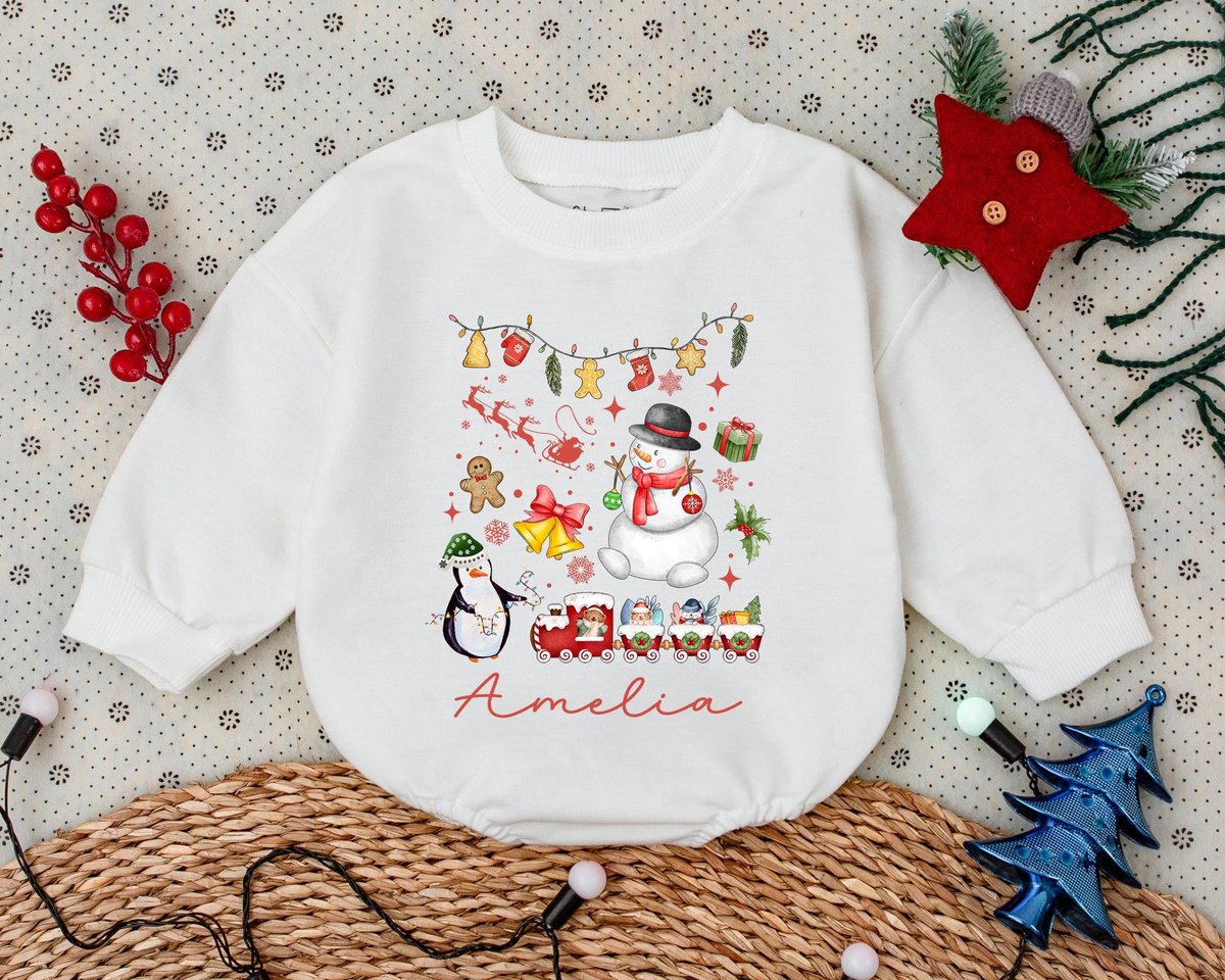 Custom Name Snowman Christmas Kids Bubble Romper Cute Toddler Holiday Tee Custom Name Merry Christma