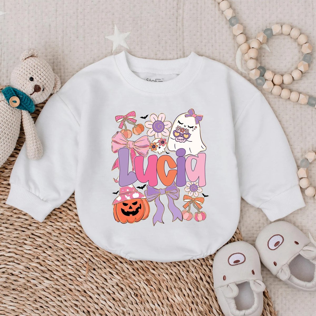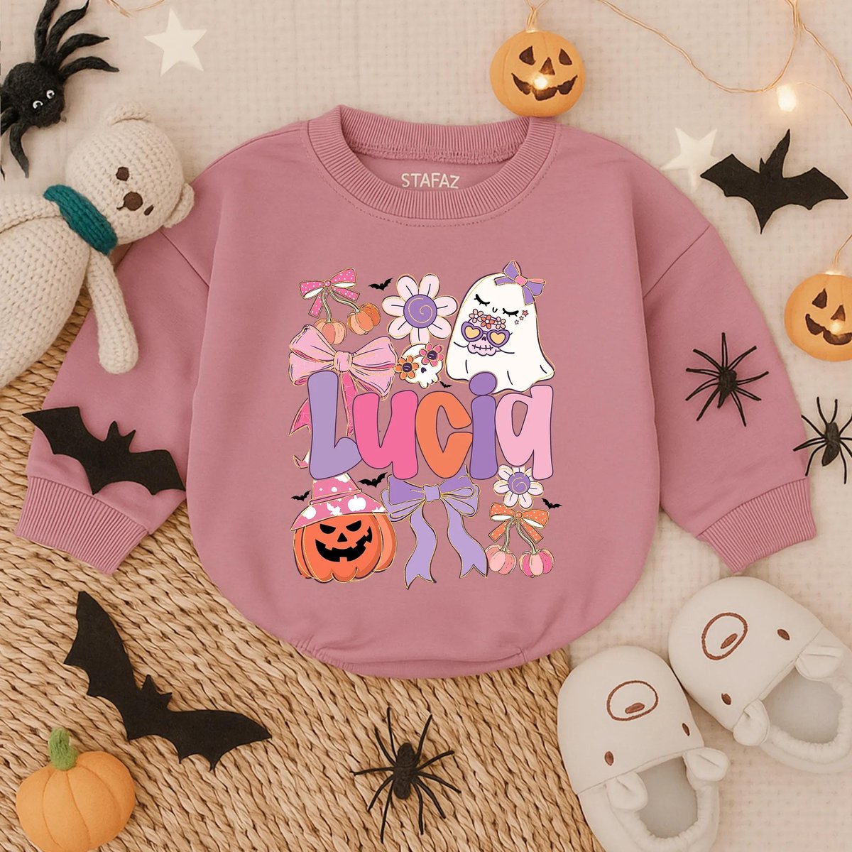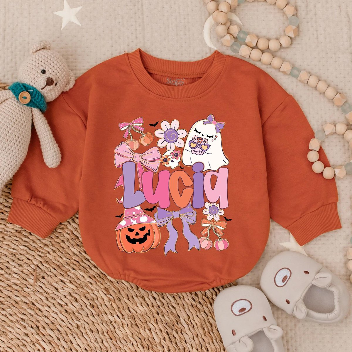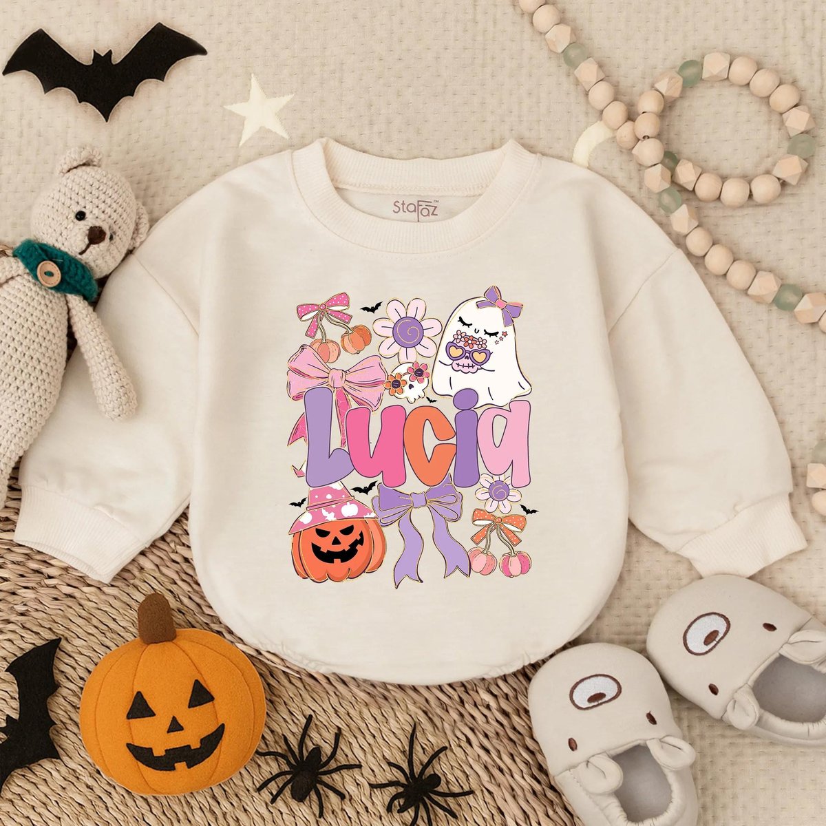 Customized Boho Ghost Baby Romper Halloween Sweatshirt Bubble Spooky Girl Pumpkin Outfit Fall Floral
