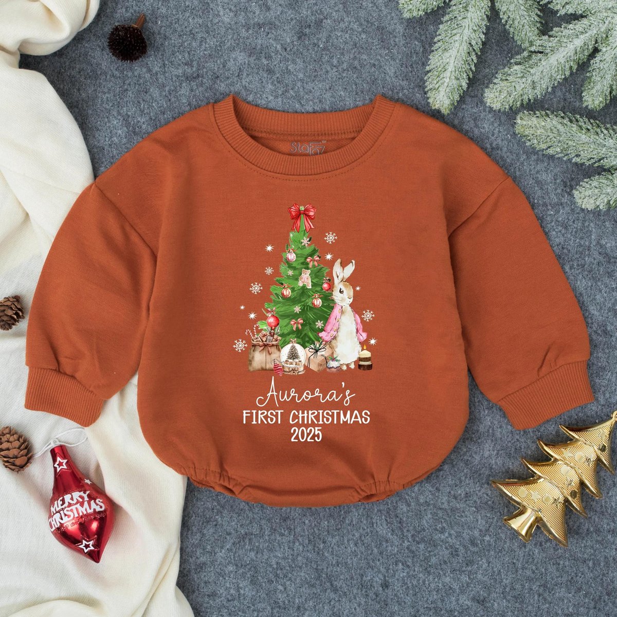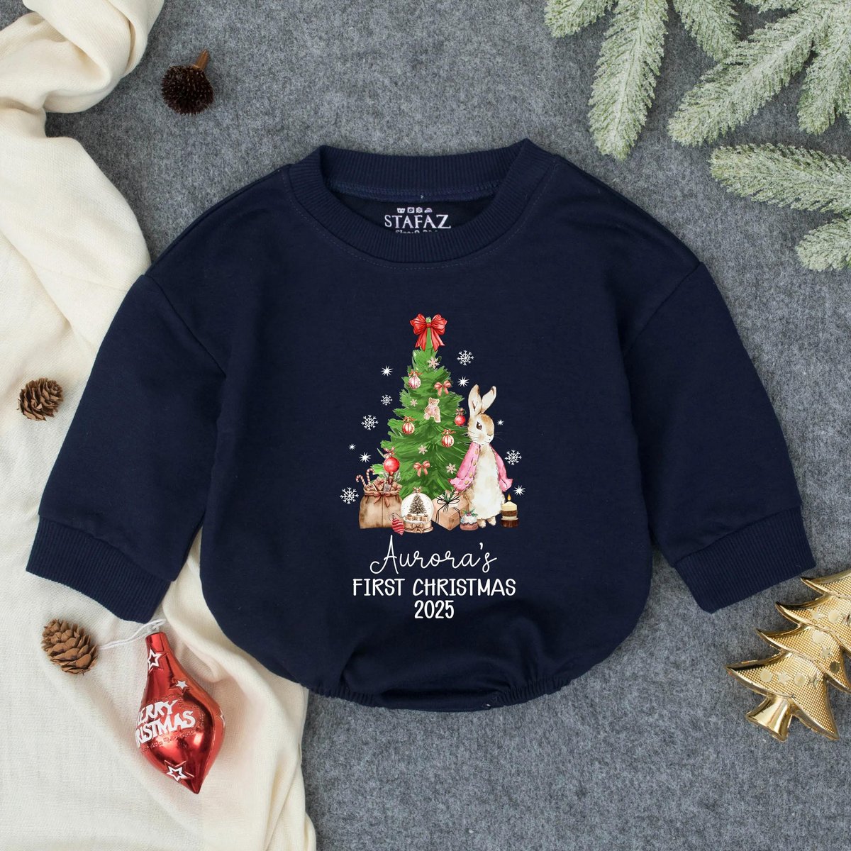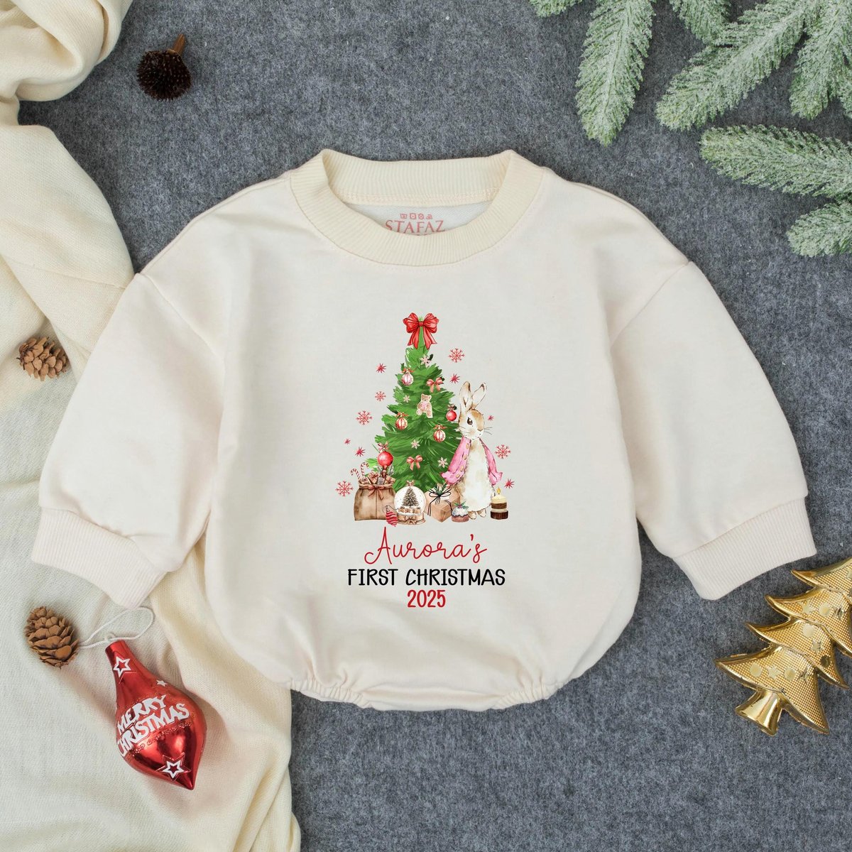 Customized Girly Bunny Christmas Bubble Romper Holiday Baby Girl Outfit Toddler Christmas Sweatshirt 435
