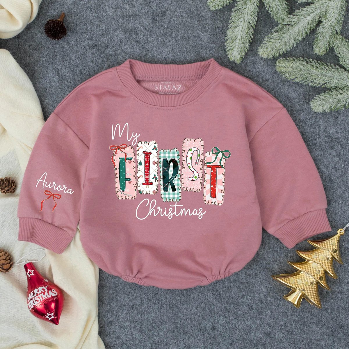 Customized Girly First Christmas Bow Bubble Romper Personalized Holiday Baby Girl Outfit Toddler Bod 436