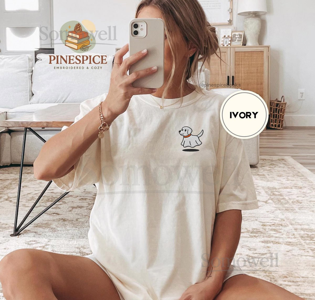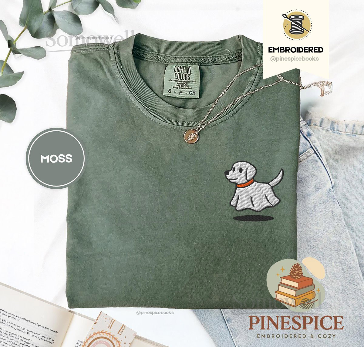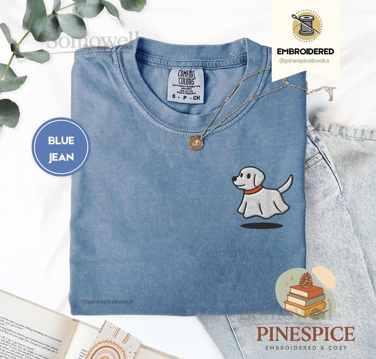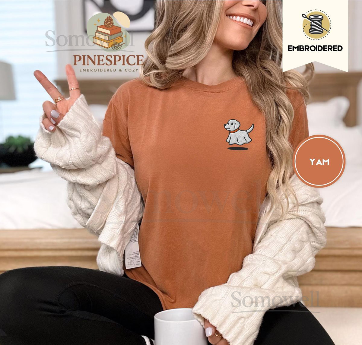 Cute Ghost Dog Tee Embroidered Halloween Dog Shirt Comfort Colors 1717 Cozy Fall T-Shirt Boo Basket Gift Spooky Puppy Tee_27