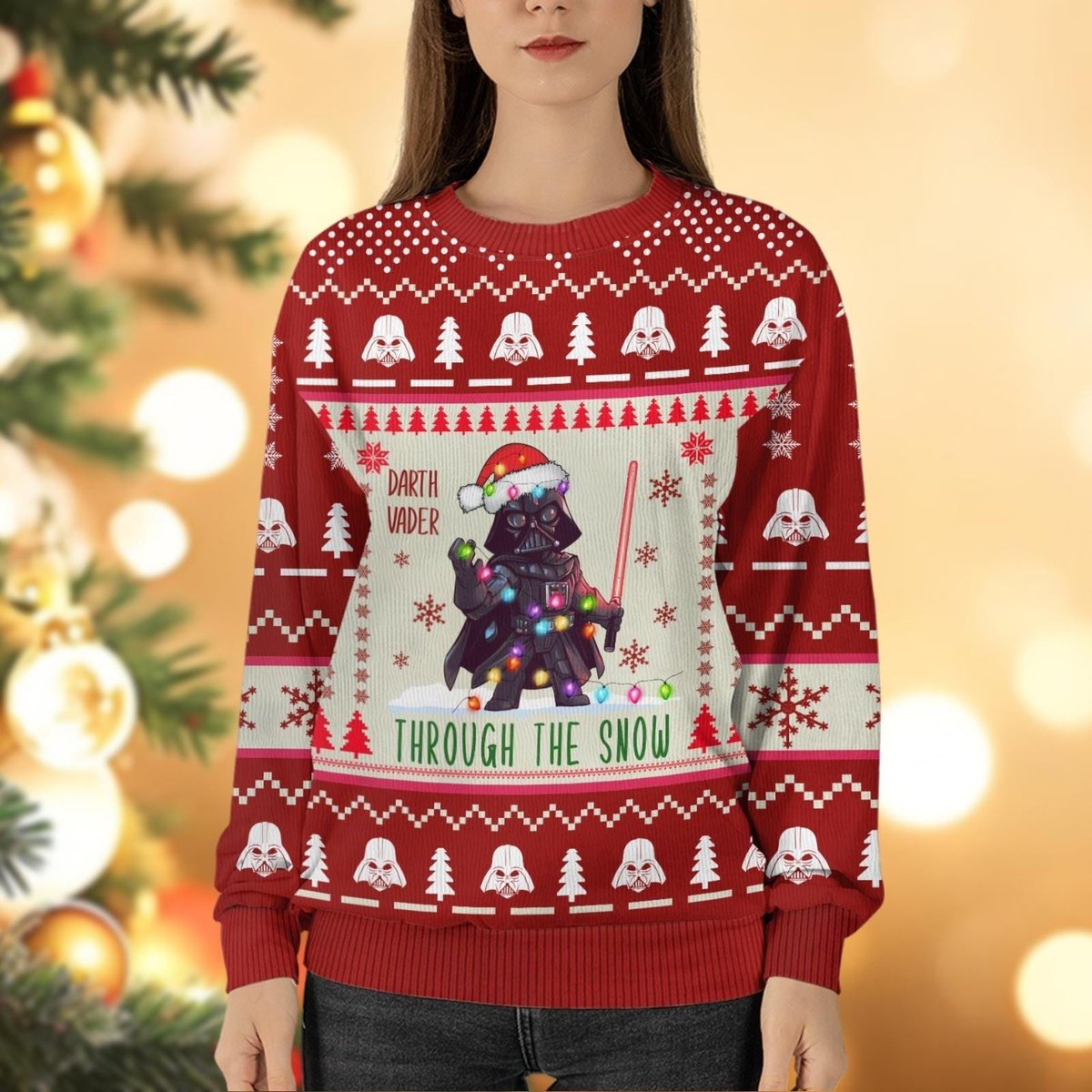 Darth Vader Through The Snow Red Ugly Christmas Sweater Funny Star Wars Holiday Knit Jumper