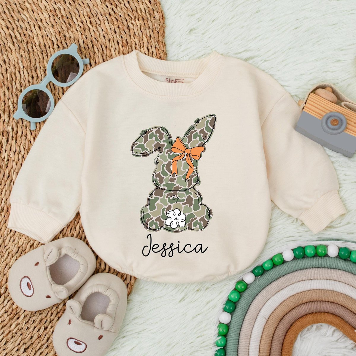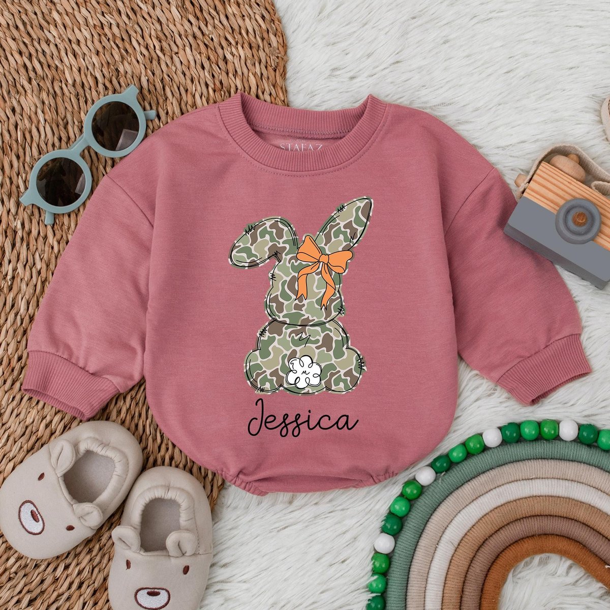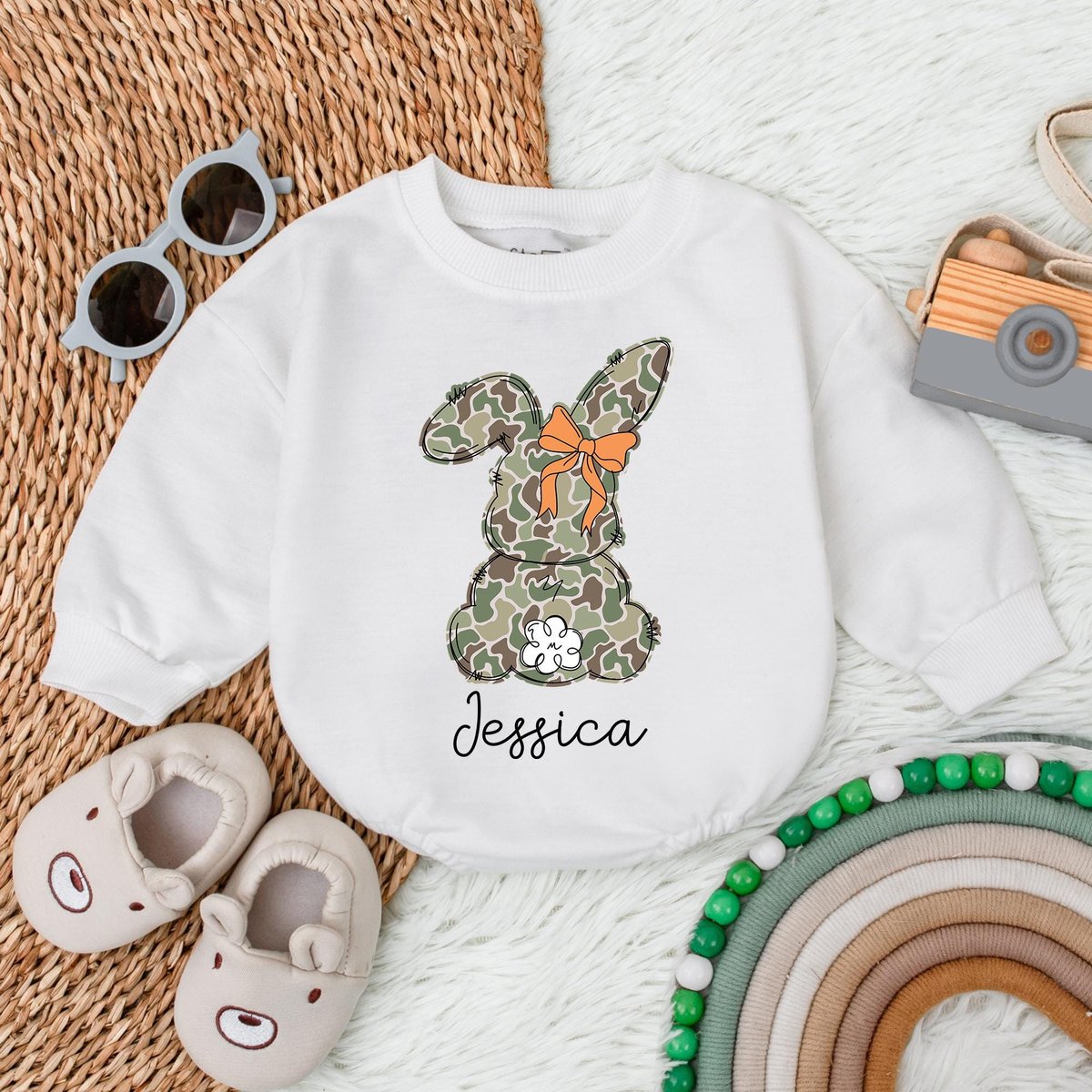 Egg Hunter Bunny Baby Romper Camo Easter Bunny Baby Outfit Girl Bunny With Backwards Hat ShirtGirl E 187