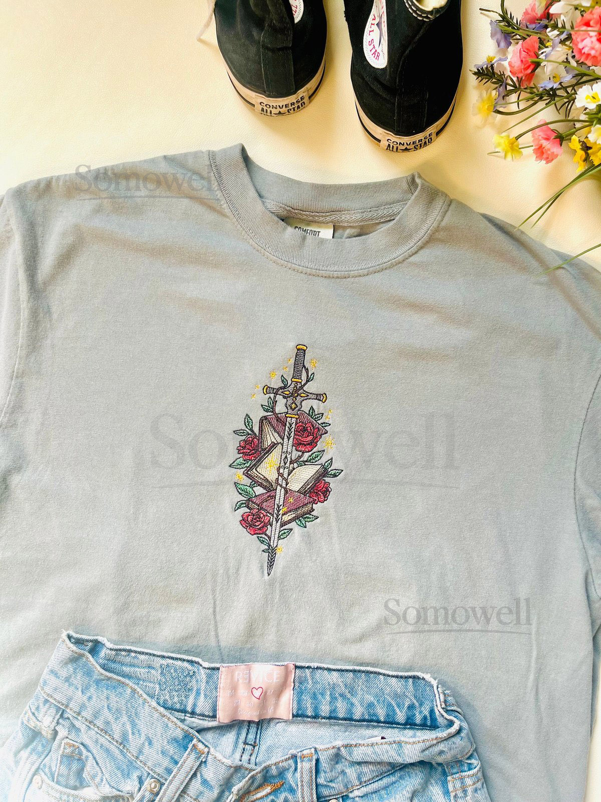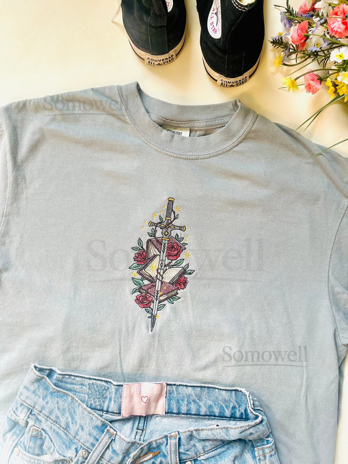 Be the first to review “Embroidered Floral Fantasy Sword Books Tee_68”