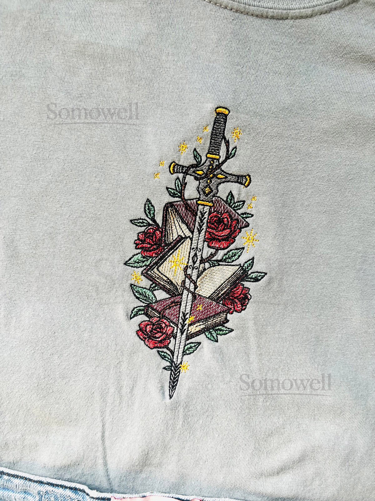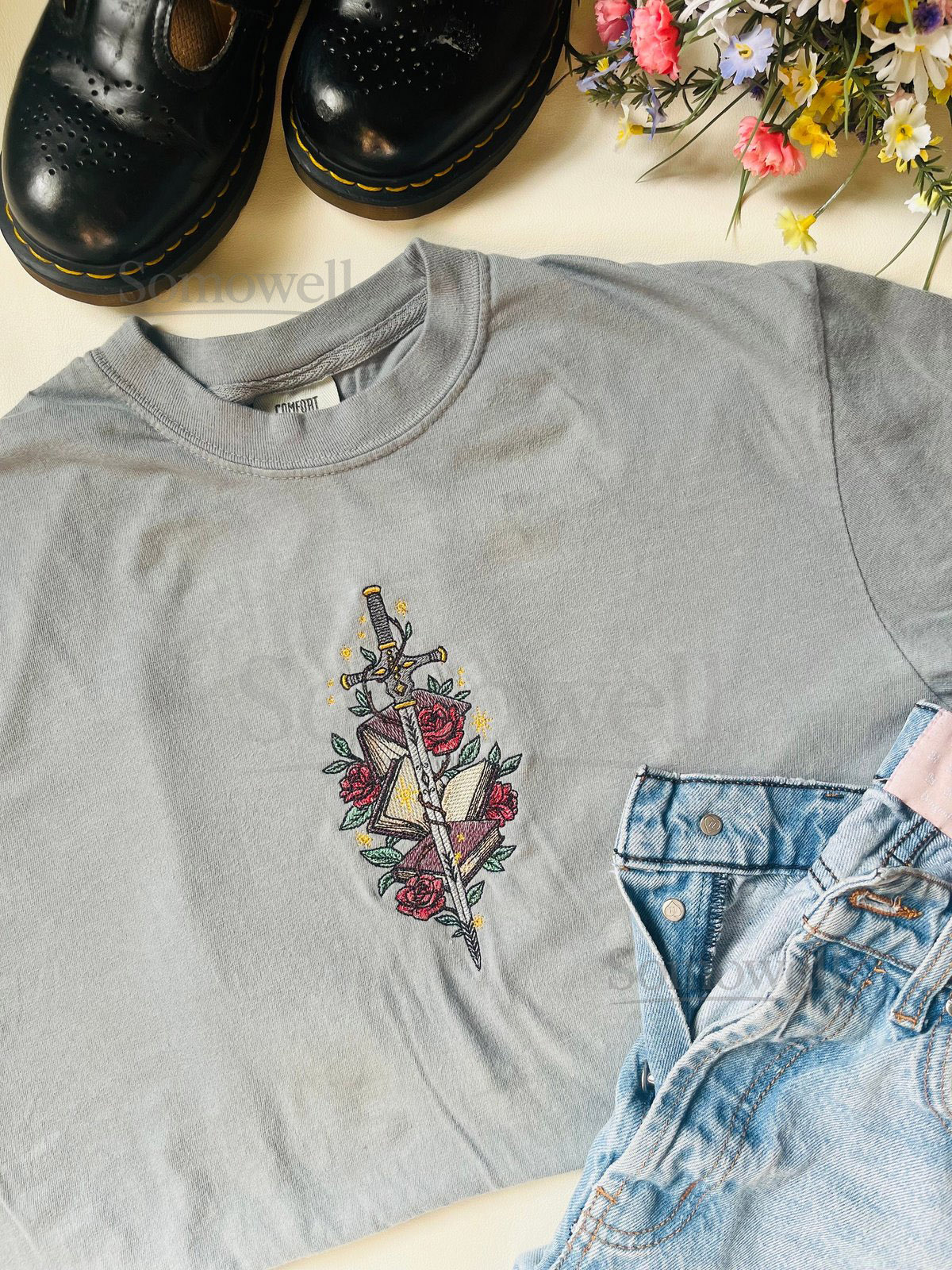 Embroidered Floral Fantasy Sword Books Tee_68