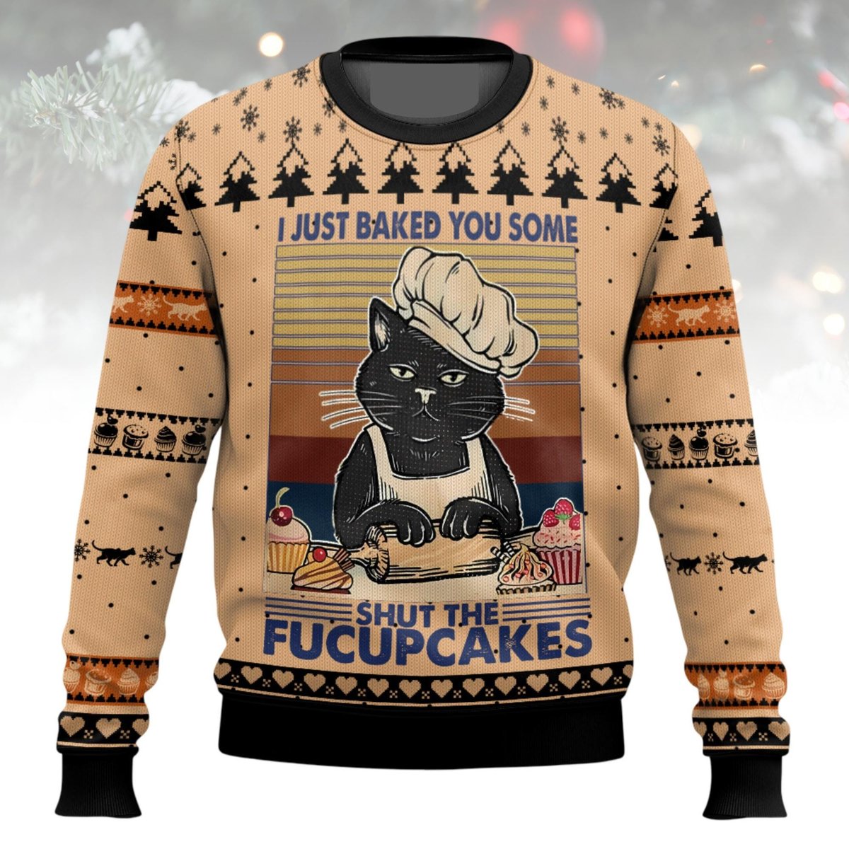 Funny Black Cat Shut The Cupcakes Family Matching Ugly Christmas Sweater
