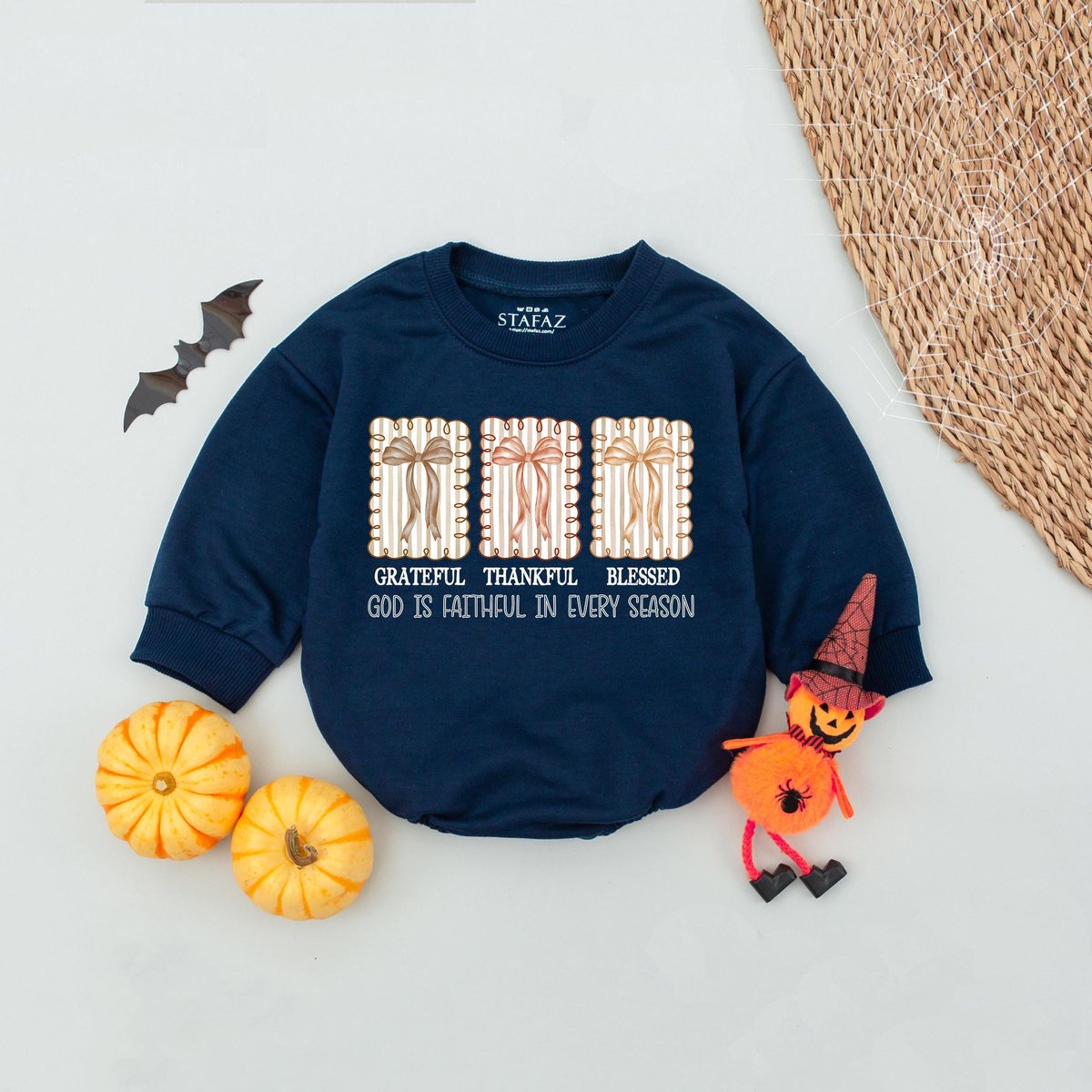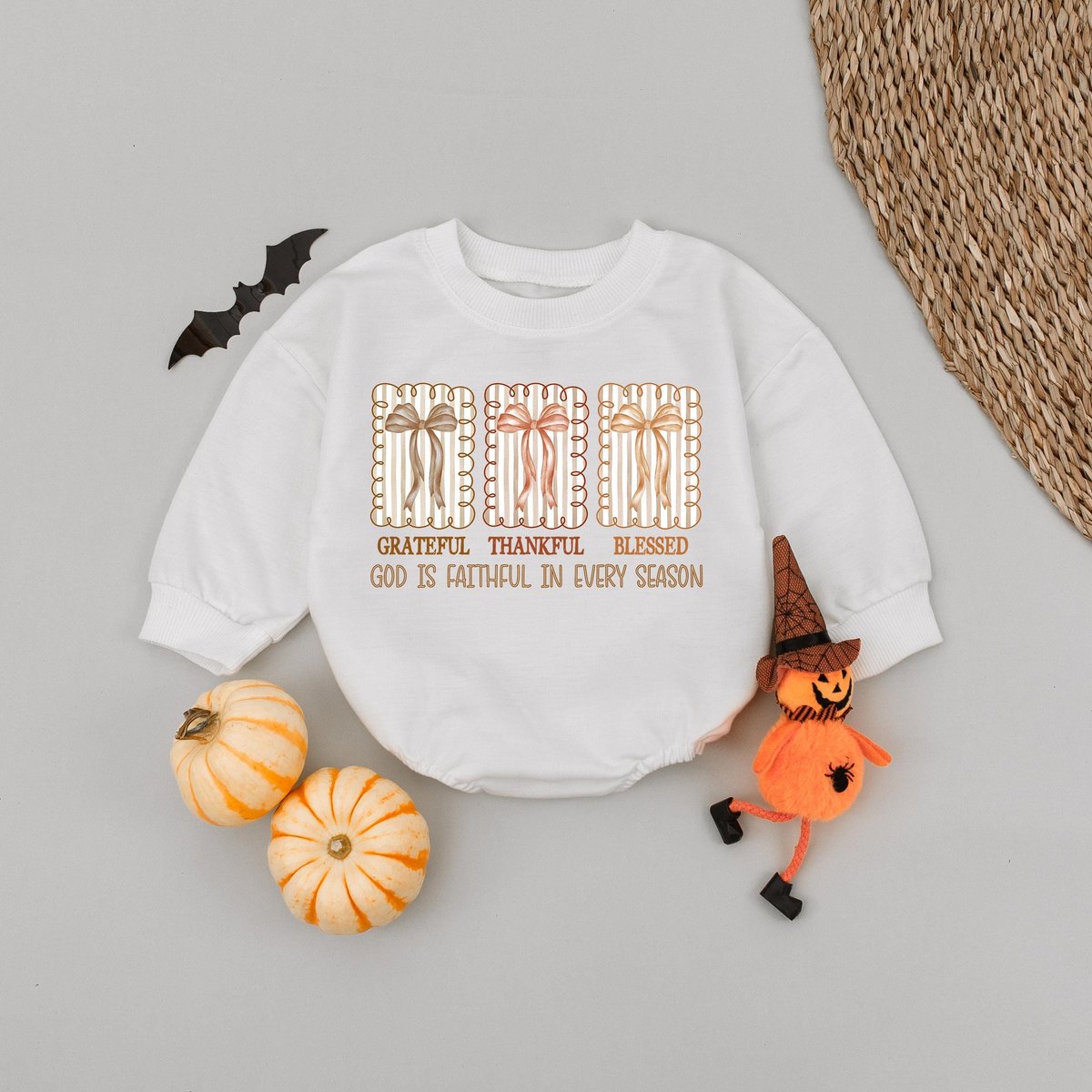 Grateful Thankful Blessed Bubble Romper Bow Fall Season Baby Romper Faith Based Autumn Babysuit Chri