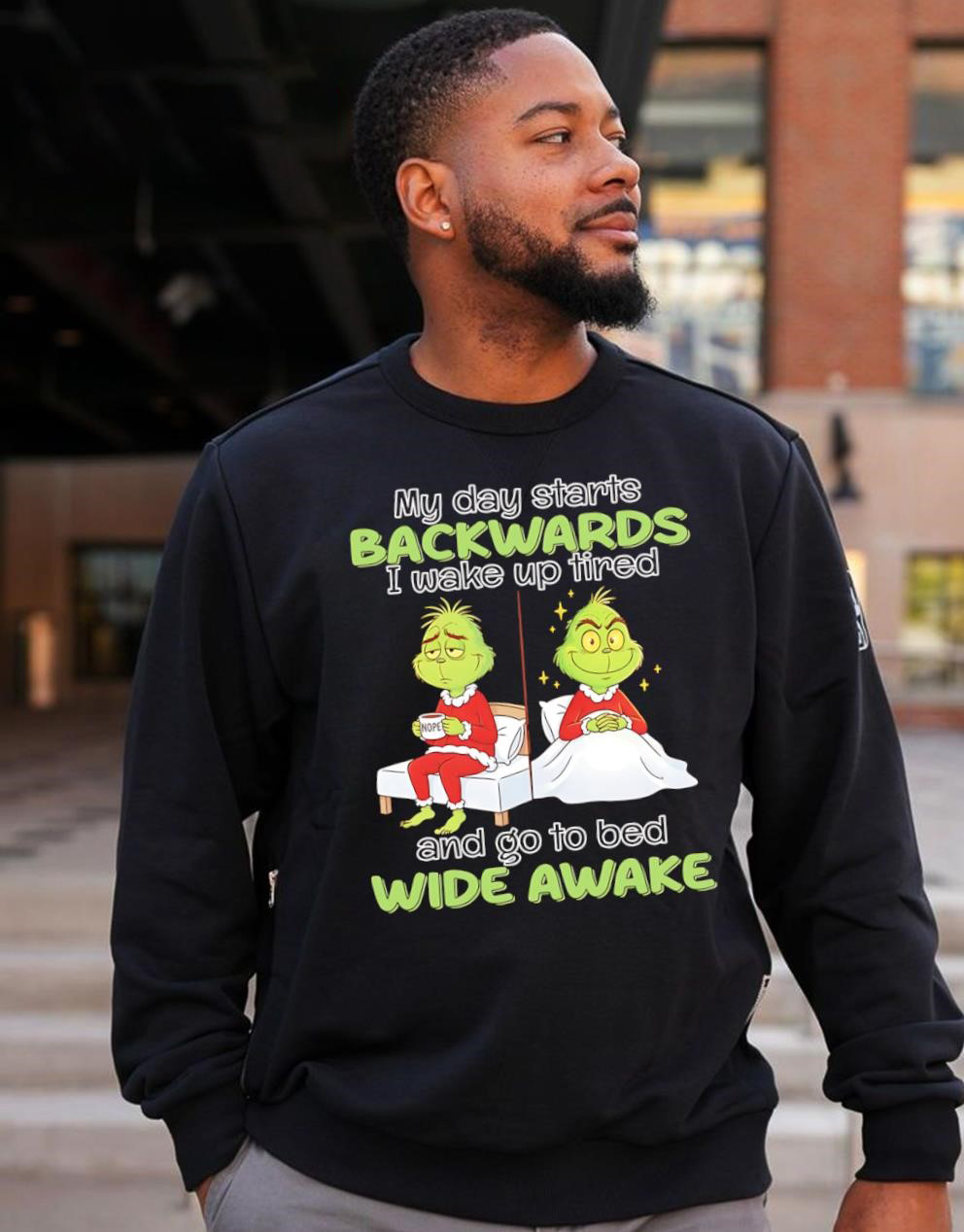 Grinch Quote Christmas T-Shirt – Funny My Day Starts Backwards I Wake Up Tired And Go To Bed Wide Awake Vintage Bootleg Holiday Tee