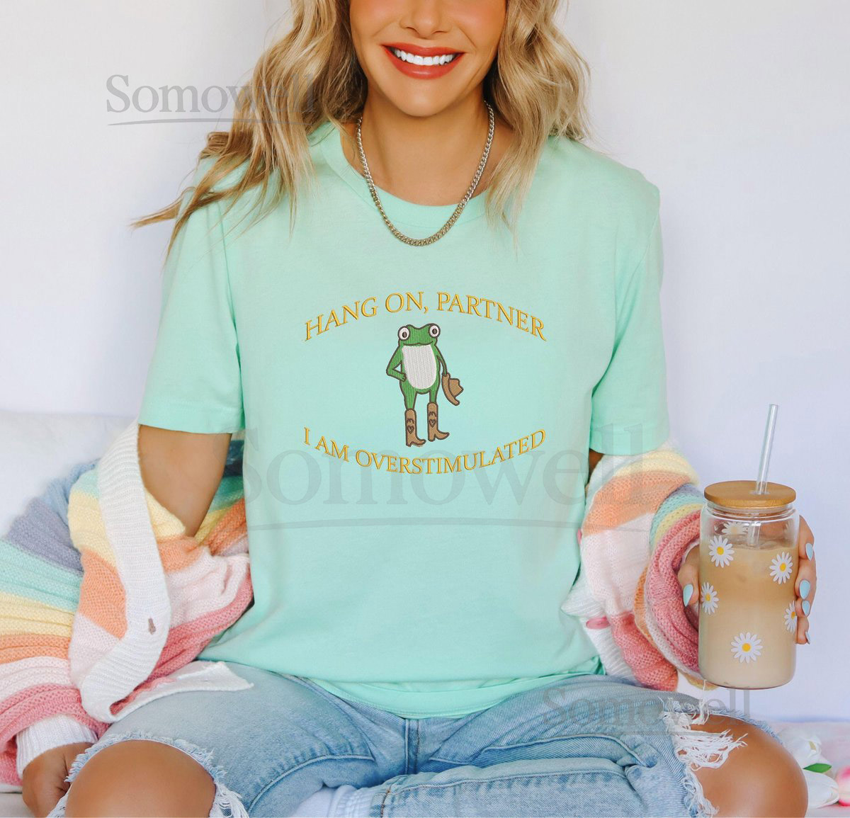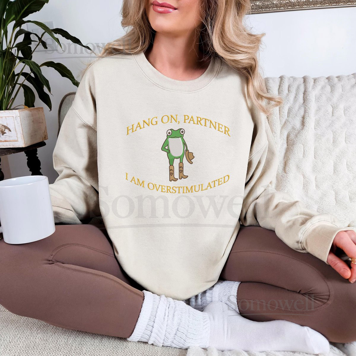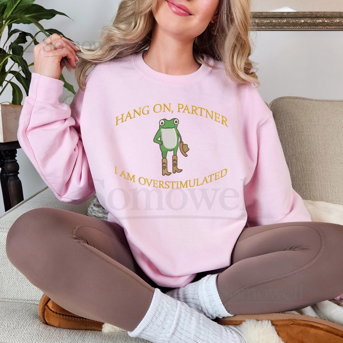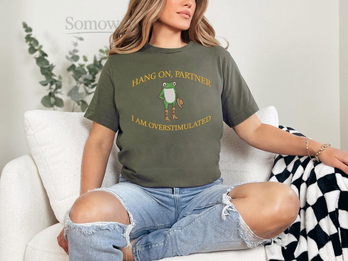 Hold On Partner Im Overstimulated Embroidered Sweatshirt Cowboy Frog Unhinged Shirt Weirdcore Gen Z Crewneck sweatshirt_107