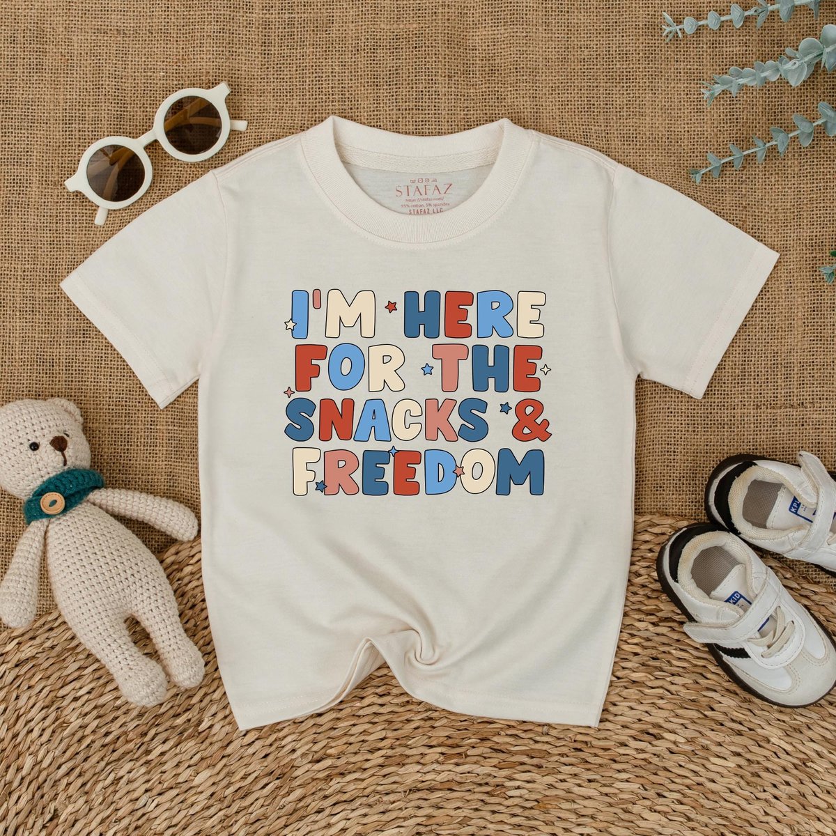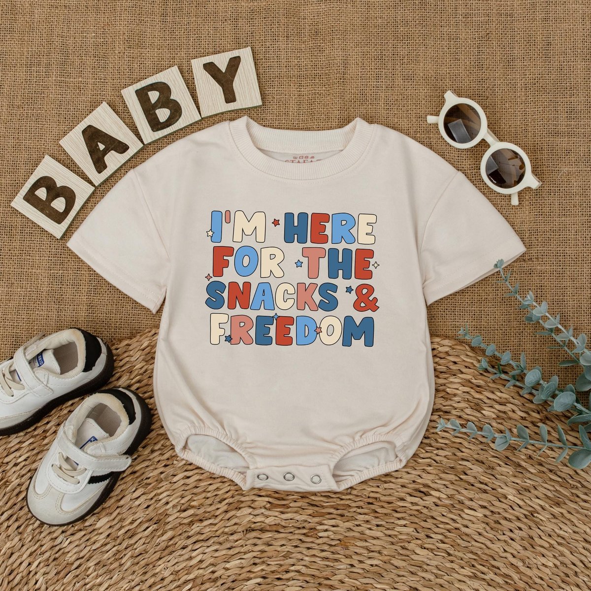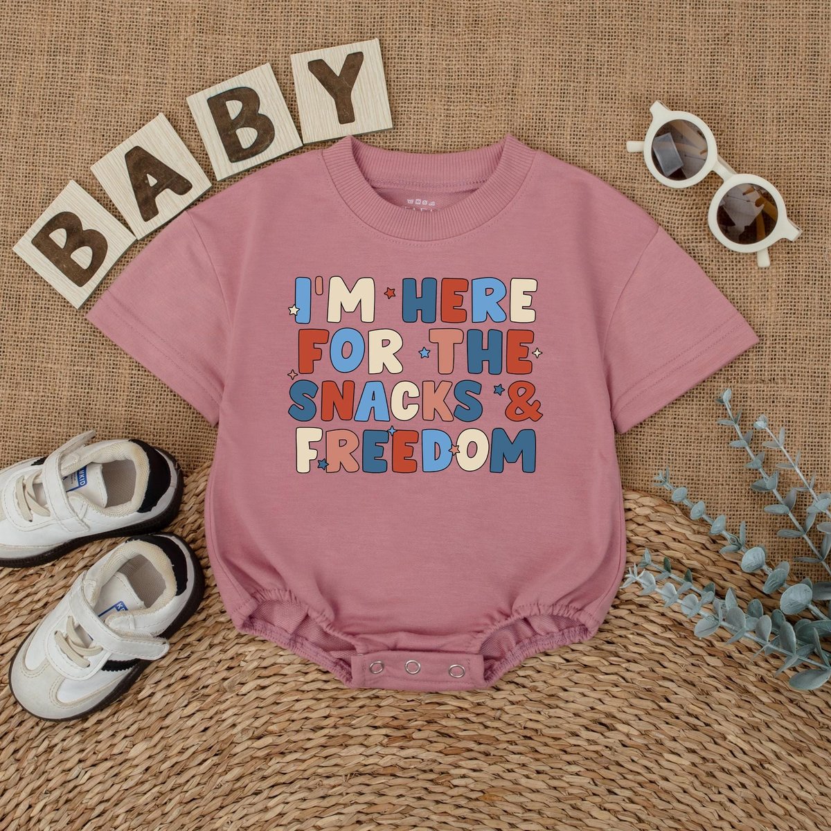 I’m Here For The Snacks And Freedom Romper Independence Day Outfit 4th of July Short Sleeve Bubble 430