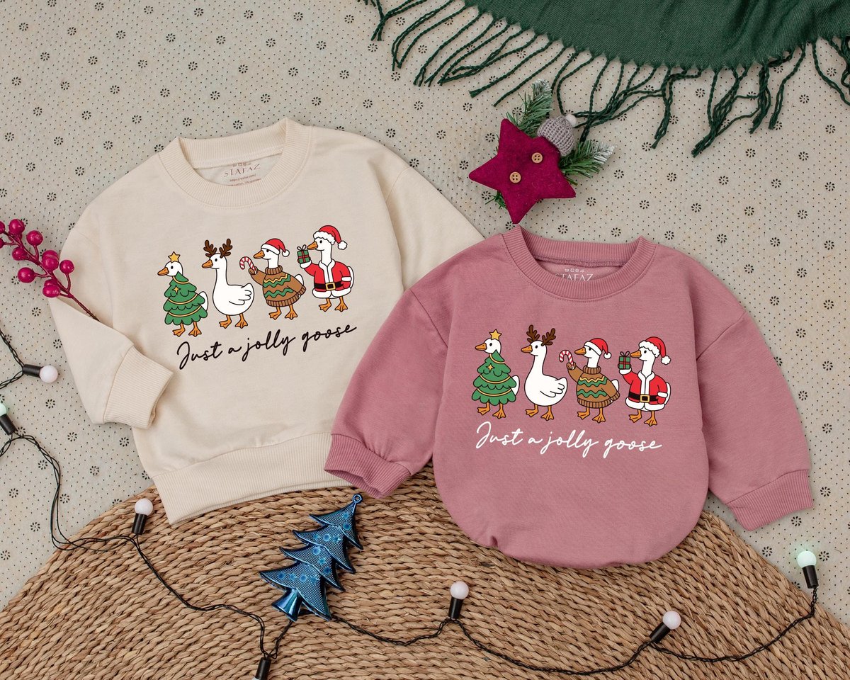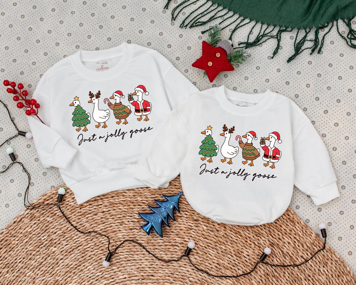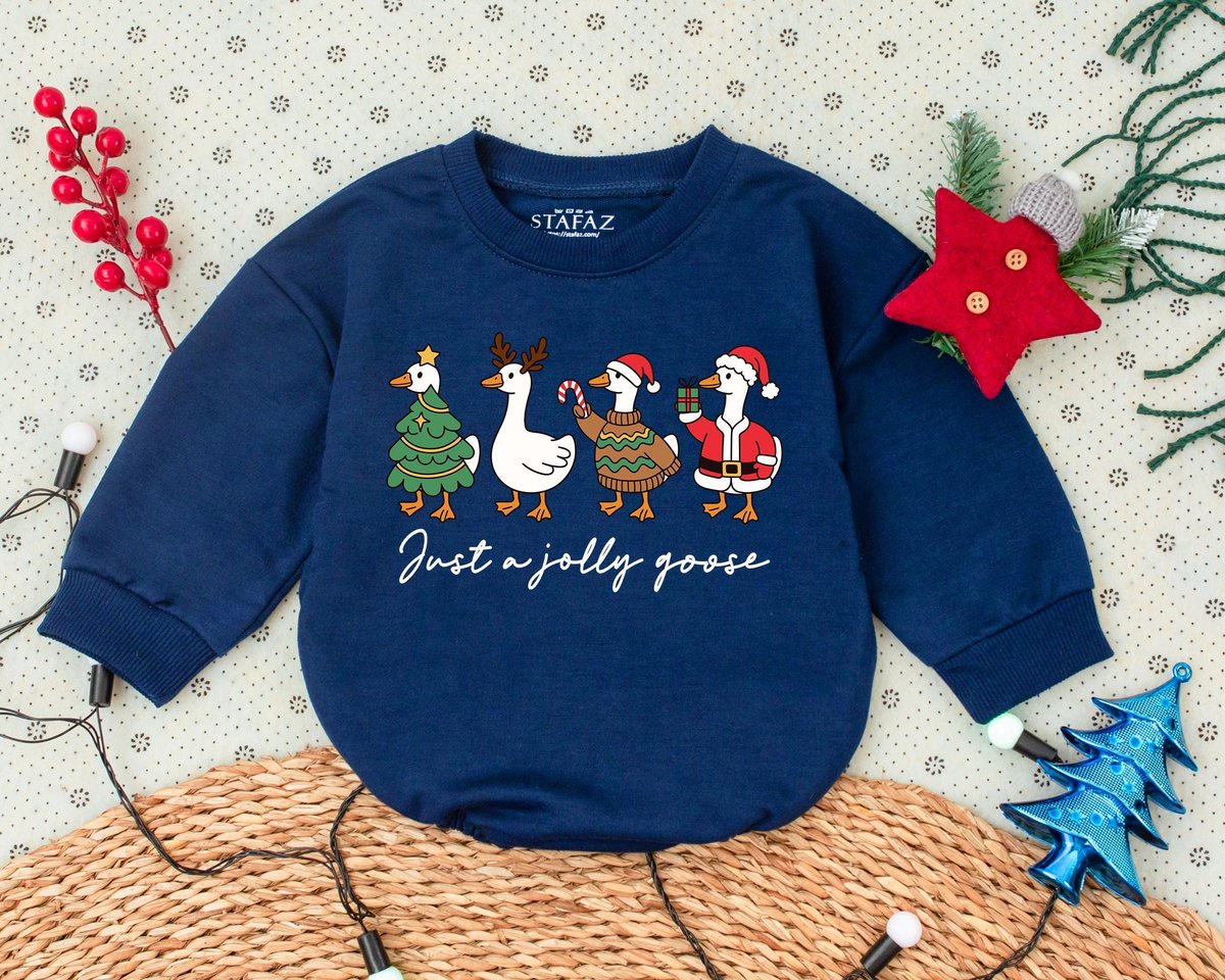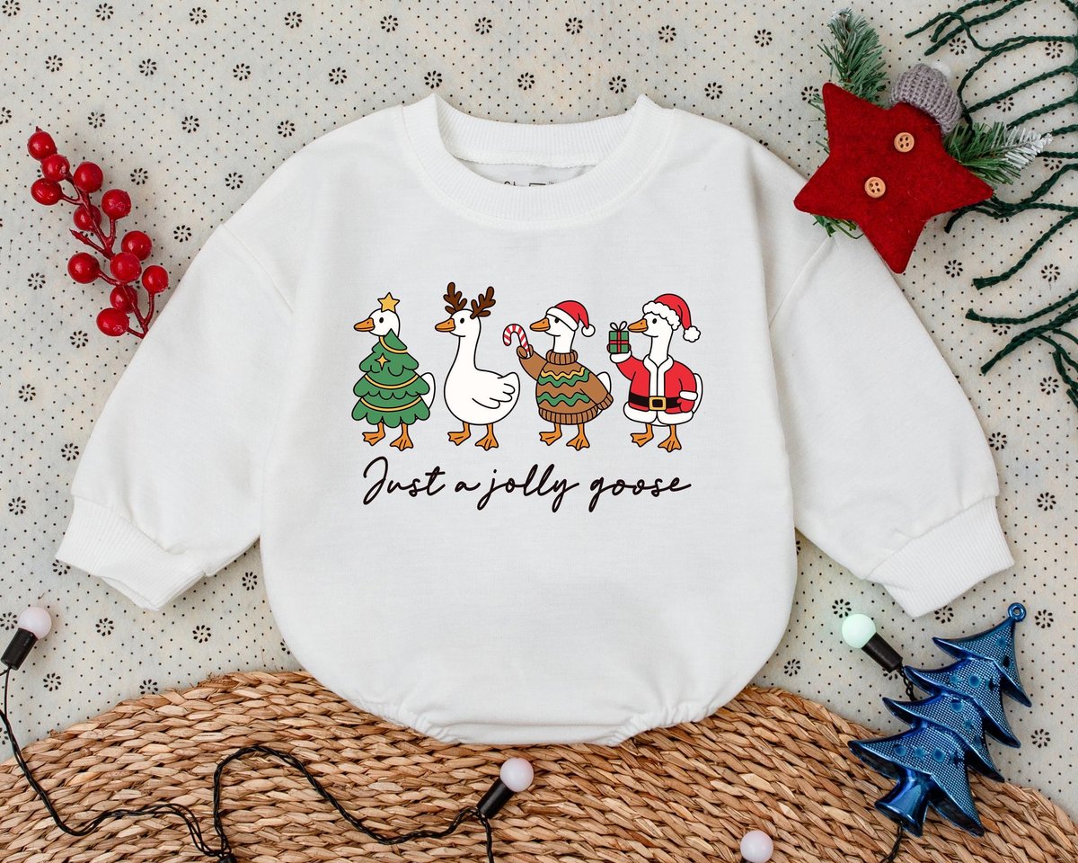 Just A Jolly Goose Bubble Romper Christmas Goose Baby Romper Duck Christmas Shirt Funny Christmas Sw