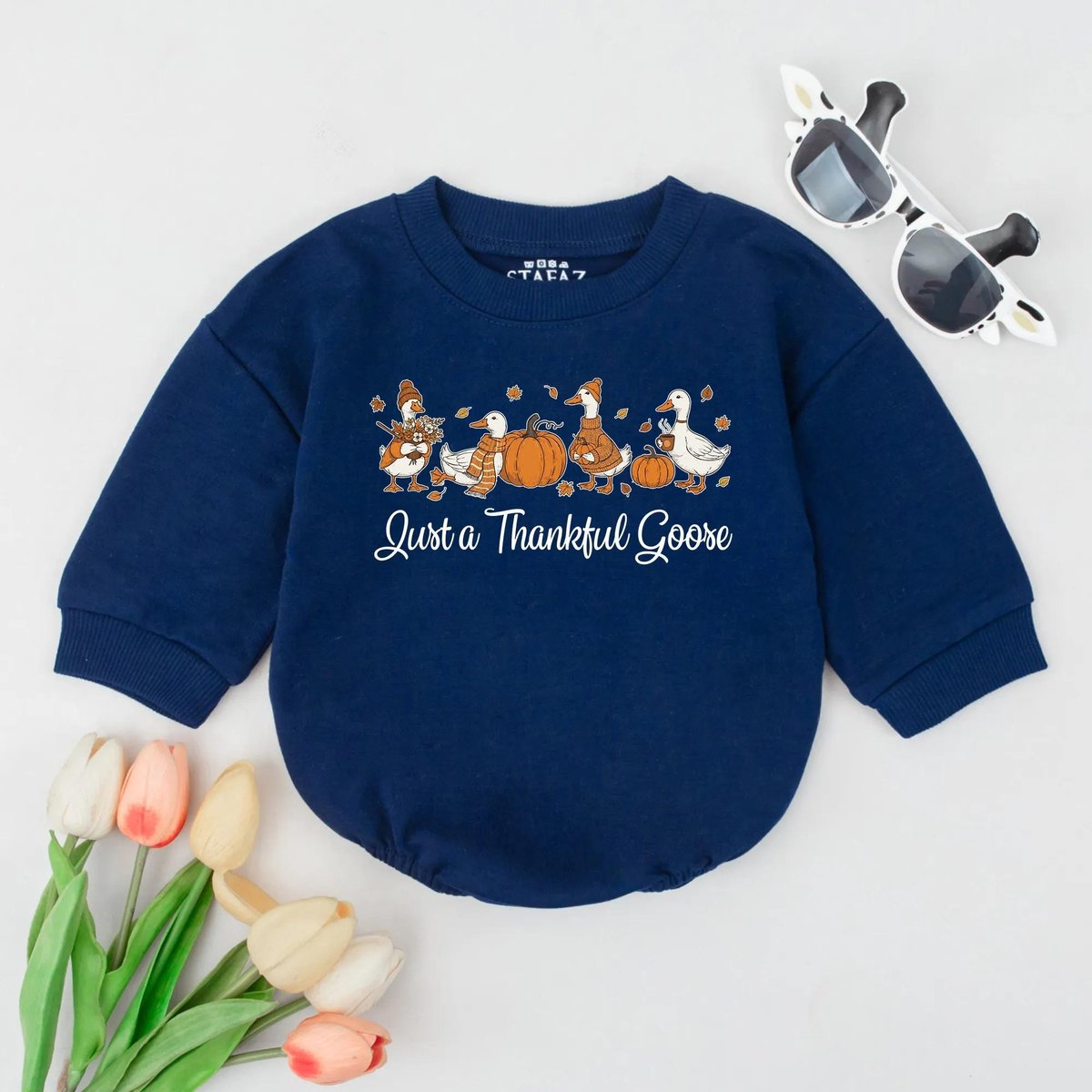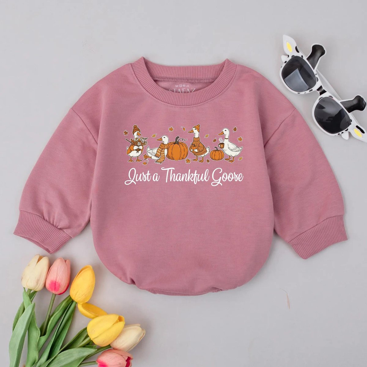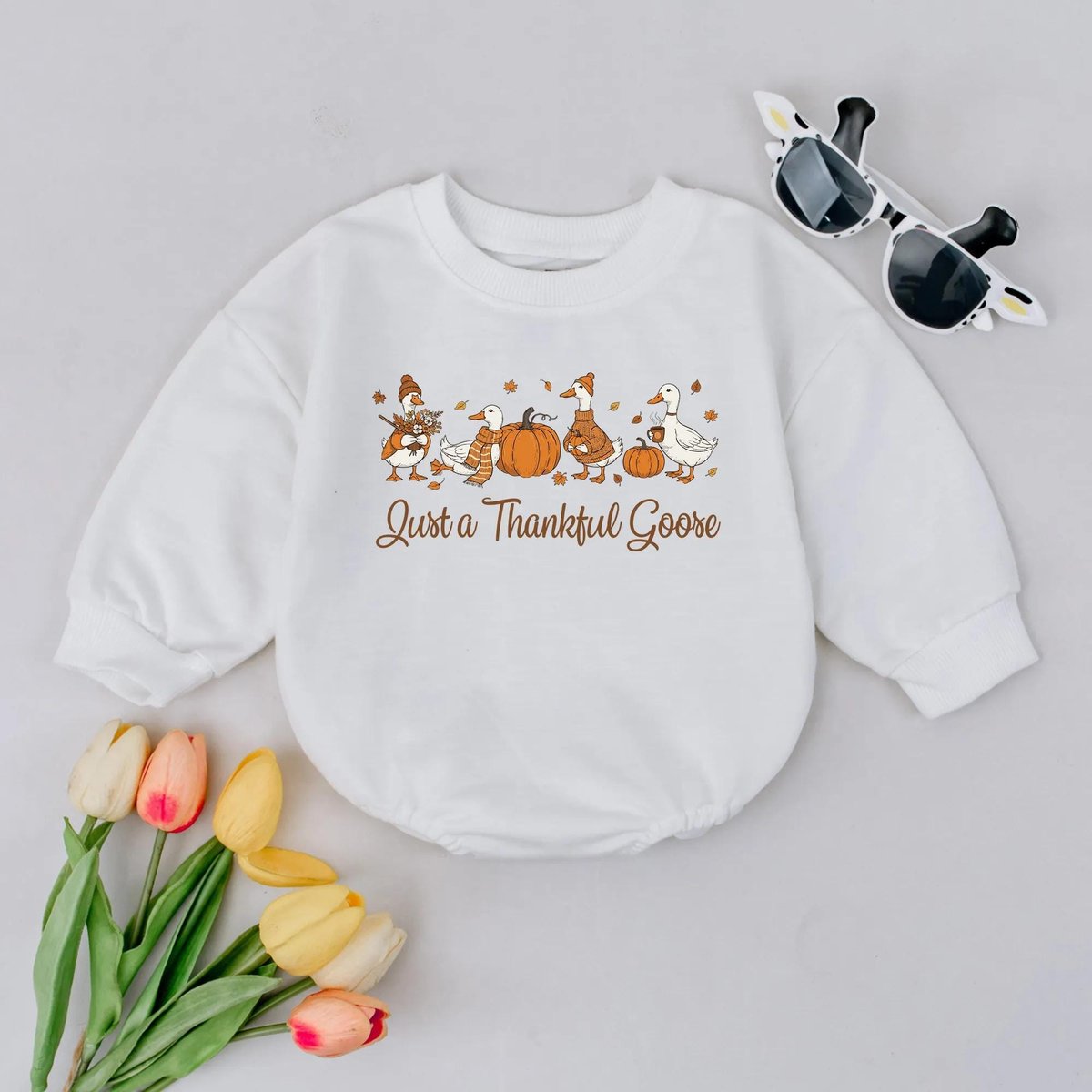 Just a Thankful Goose Bubble Romper Thanksgiving Pumpkin Outfit Silly Goose Baby Clothes Cozy Fall V 437