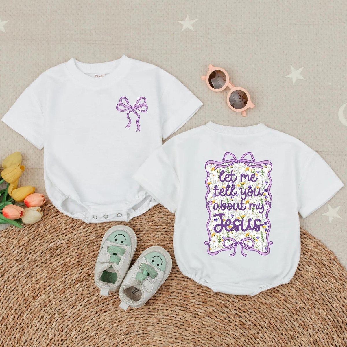 Let Me Tell You About My Jesus Christian Wildflower Short Sleeve Bubble Romper Religious Baby Outfit