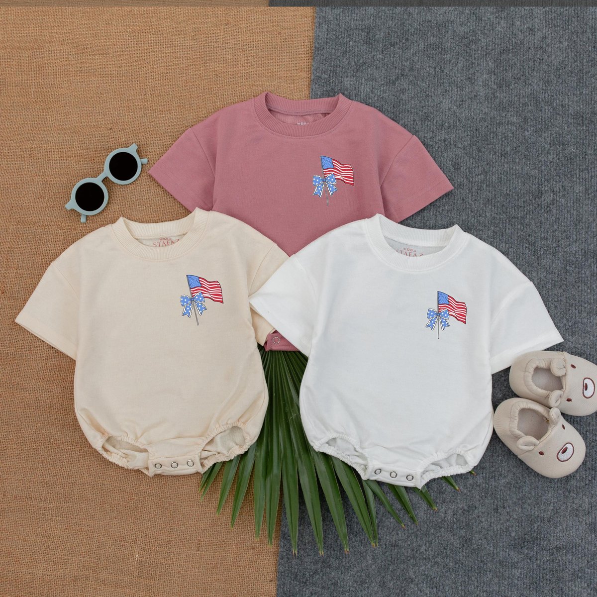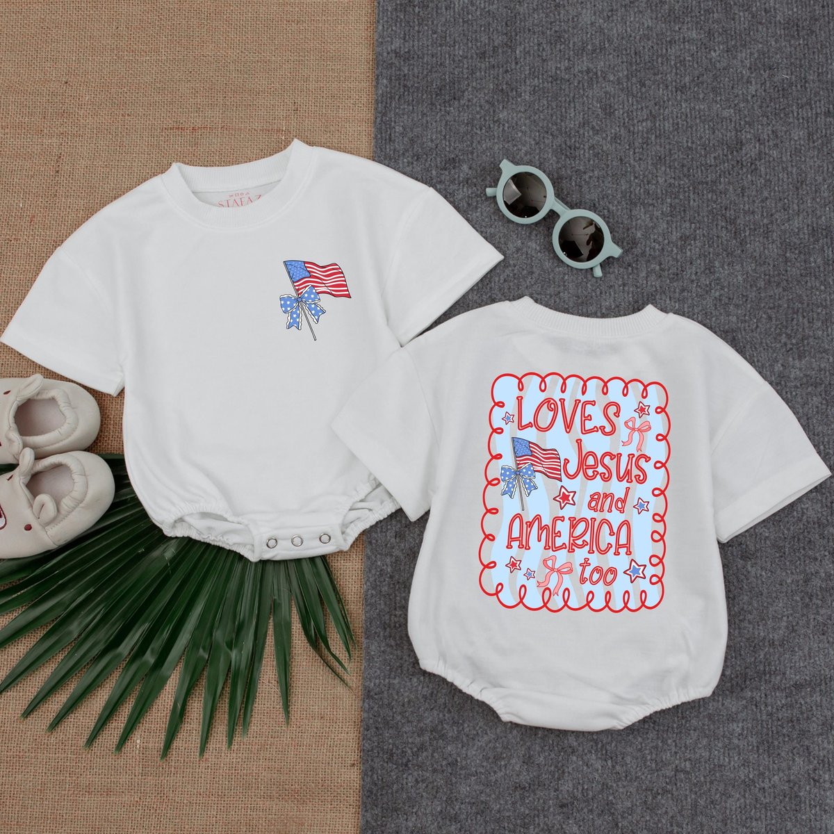 Loves Jesus and America Too Short Sleeve Bubble Romper Patriotic Baby Outfit Red White Blue Toddler 431