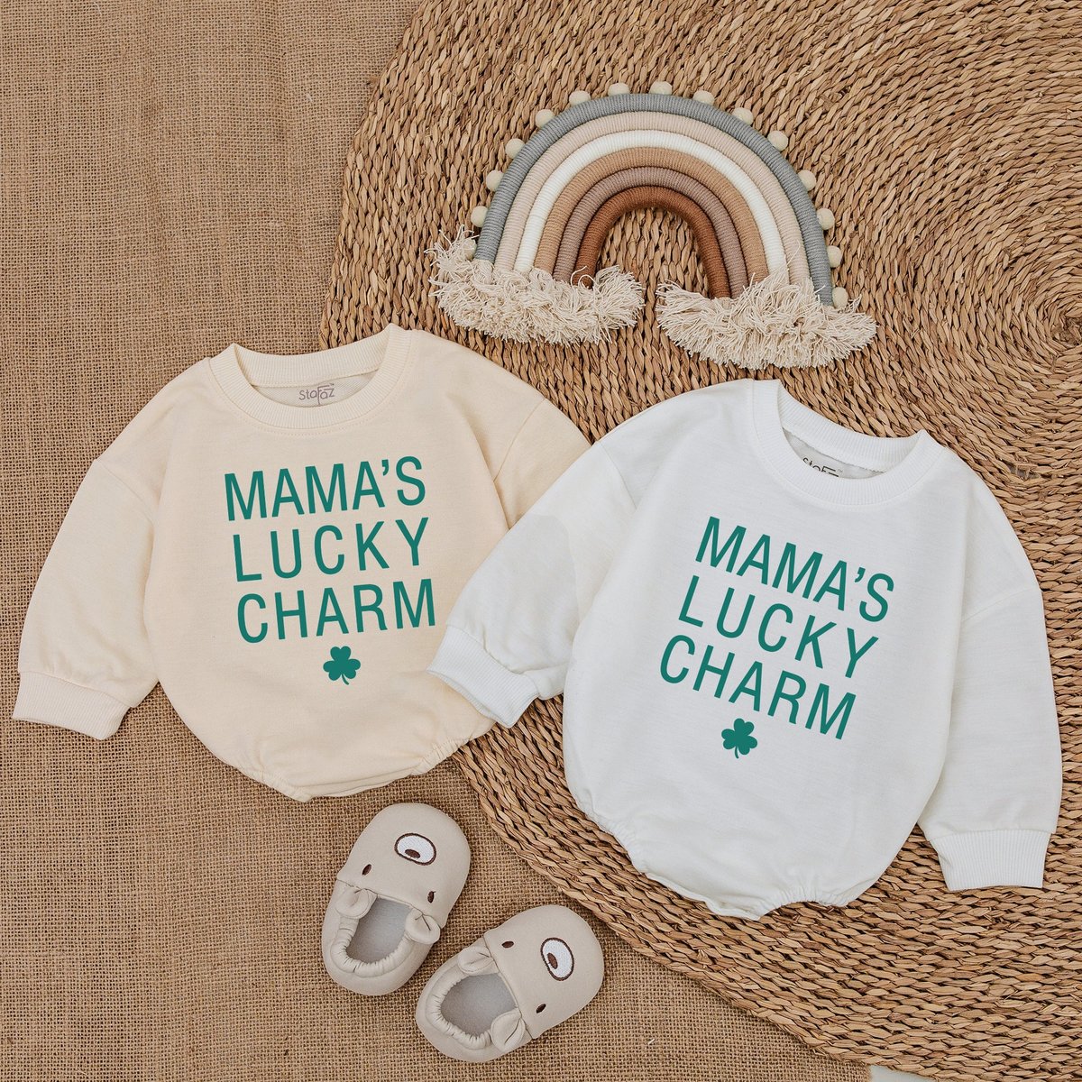 Mama’s Lucky Charm Baby Romper St Patrick’s Day Bodysuit Natural Irish Baby Outfit Light Mauve