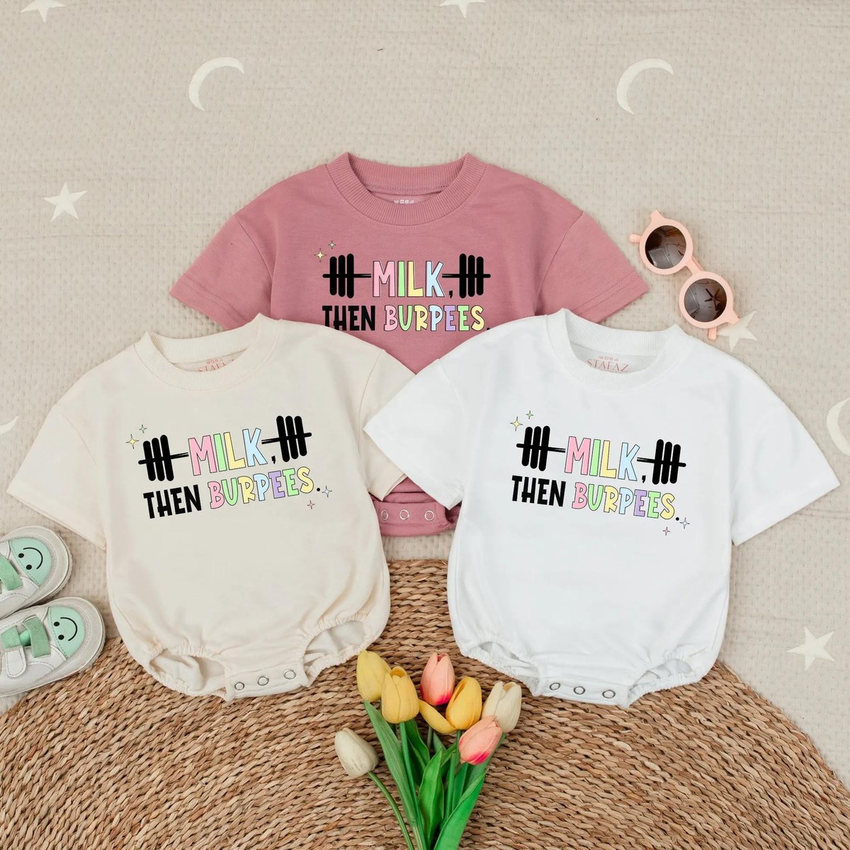 Milk Then Burpees Baby Romper Funny Newborn Baby Short Sleeve Bubble Romper Cute Gym Baby Outfit Wor