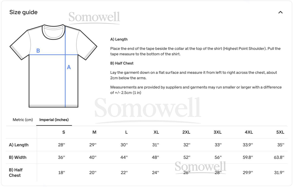 T-shirt 2XL, T-shirt 3XL, T-shirt 4XL, T-shirt 5XL, T-shirt L, T-shirt M, T-shirt S, T-shirt XL, T-shirt XS
