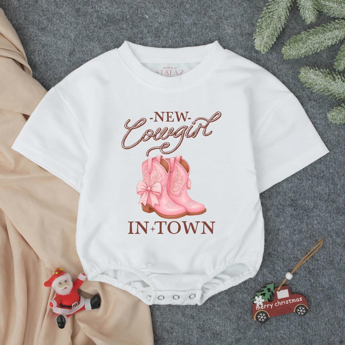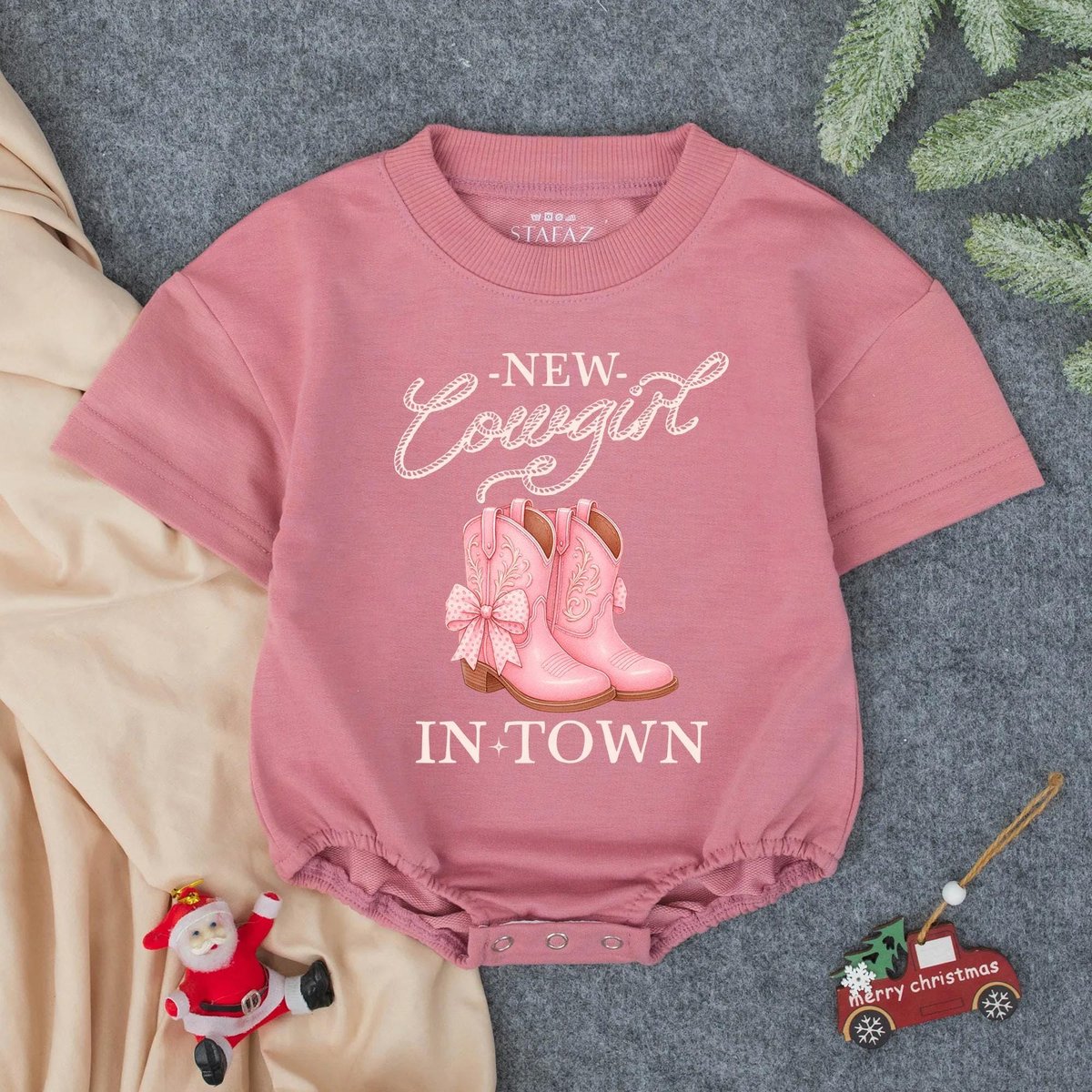 New Cowgirl In Town Short Sleeve Bubble Romper Cowgirl Baby Bodysuit Coming Home Outfit Cow Girl Wes 436